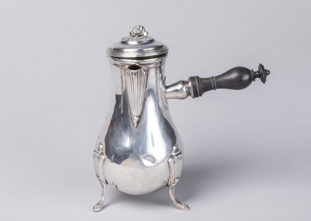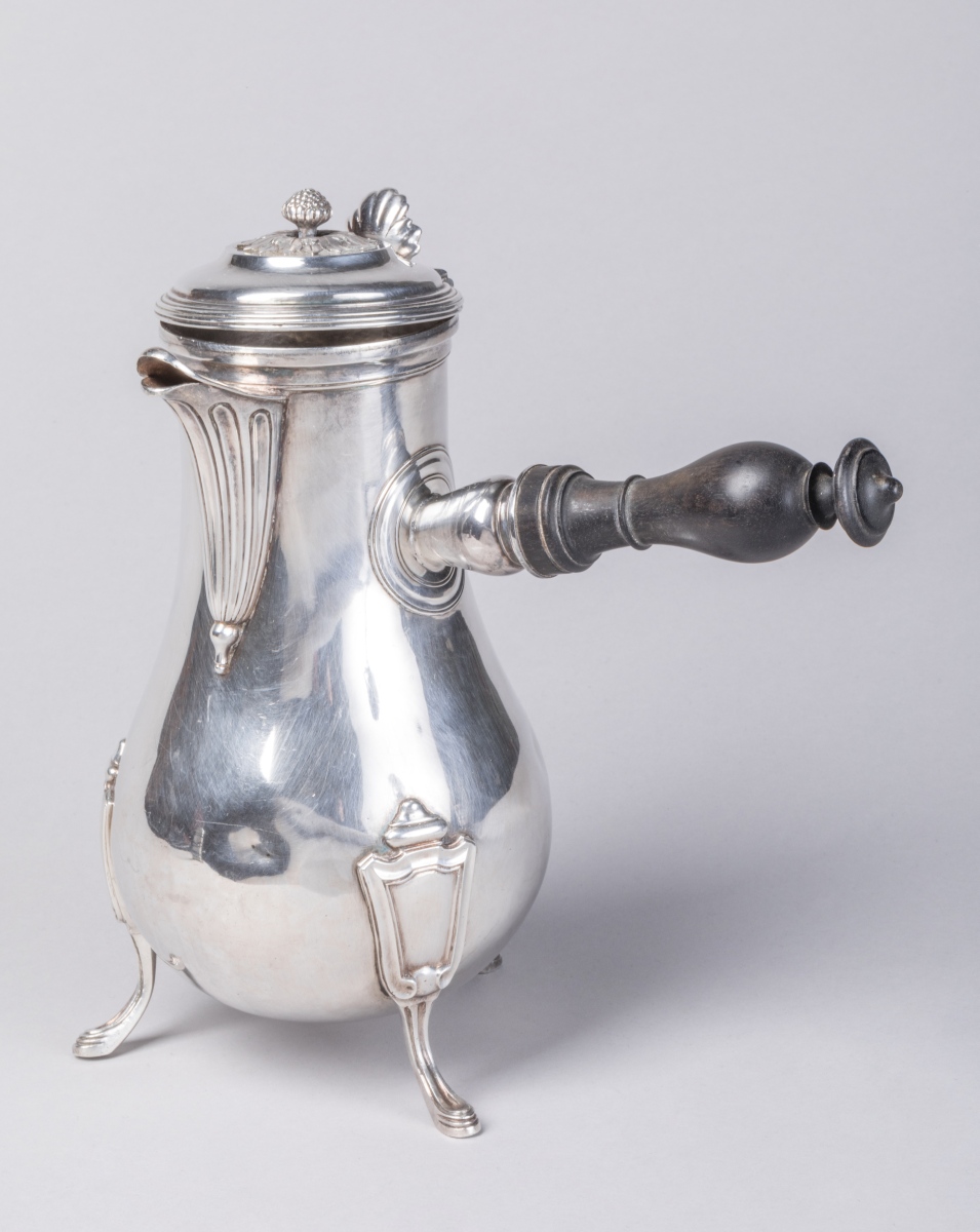 Bec verseur dit "canard" agrémenté de cannelures. Fretel en graine sur terrasse feuillagée, manche latéral en bois tourné et noirci. Elle repose sur trois pieds patins à applique en cartouche.