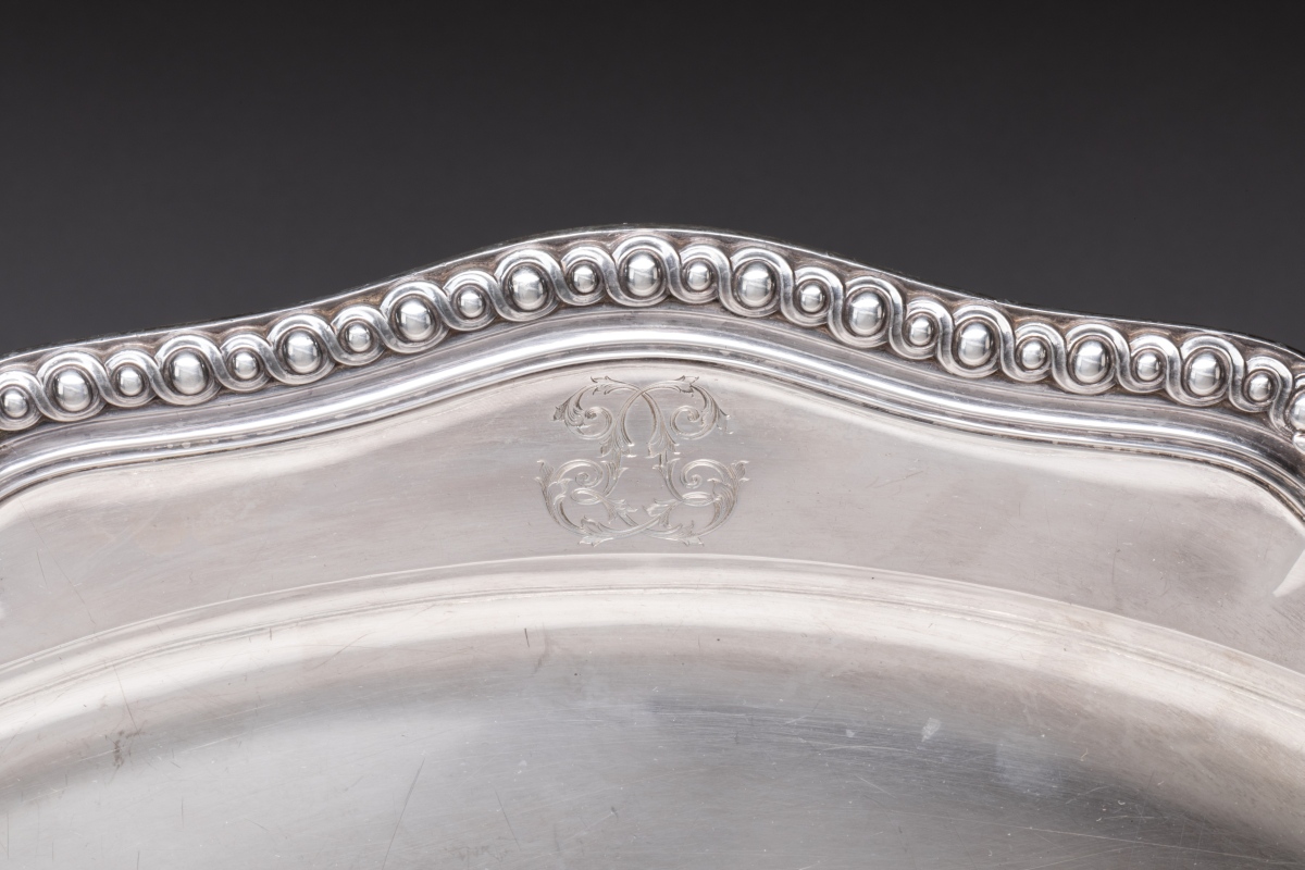 PARIS. ODIOT. PLAT de forme ovale en argent. Bordure mouvementée...