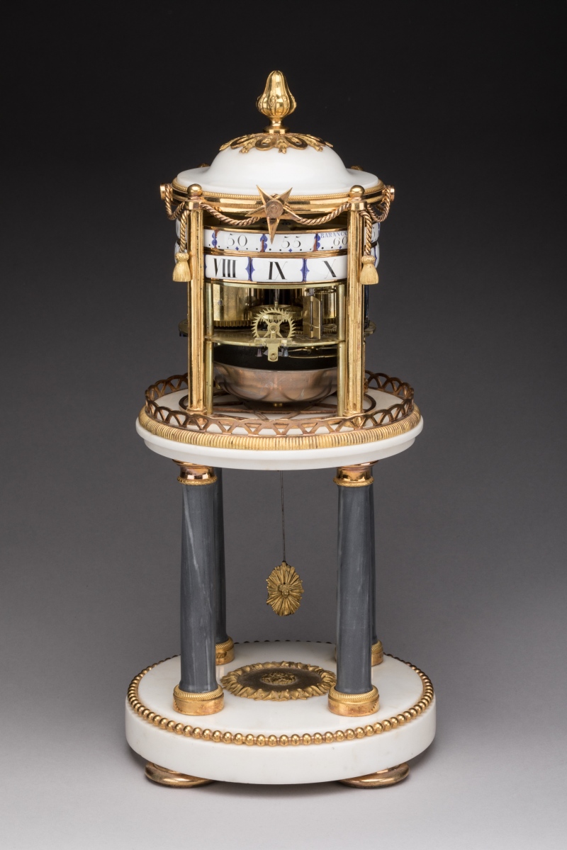 PENDULE TOURNANTE en marbre blanc, soutenue par quatre colonnes en...