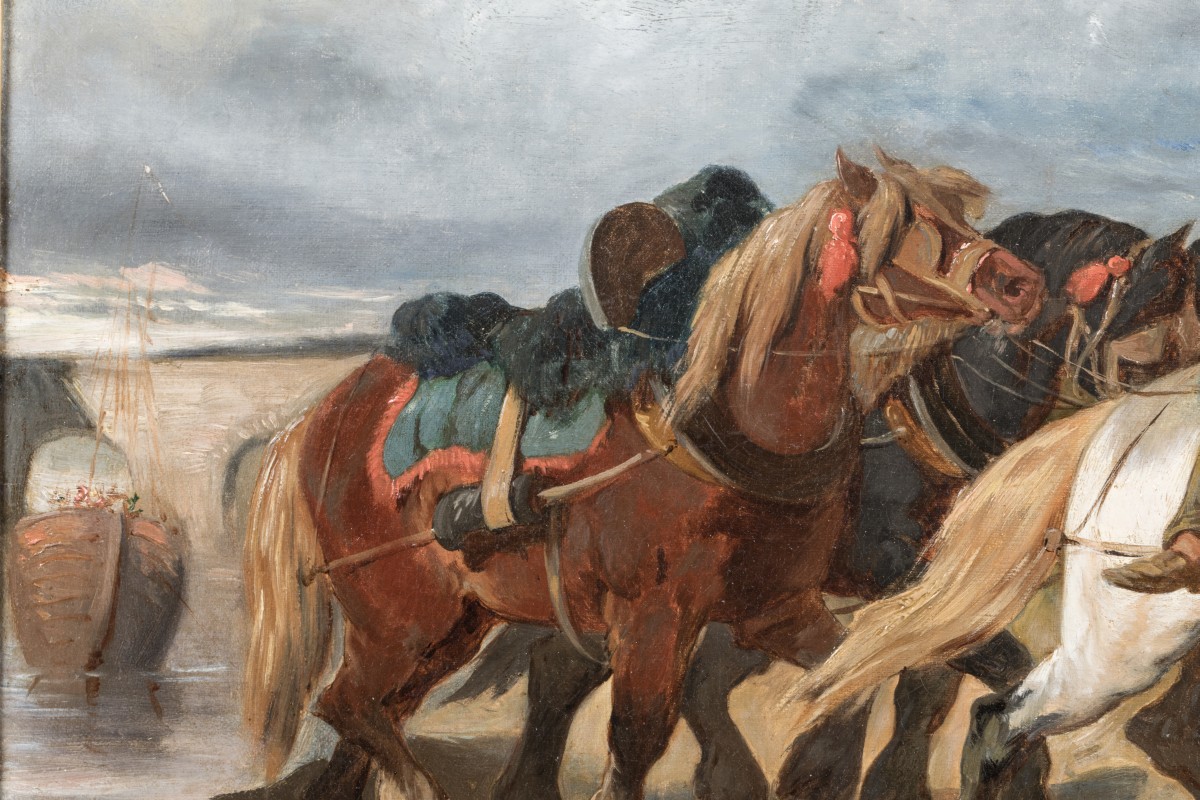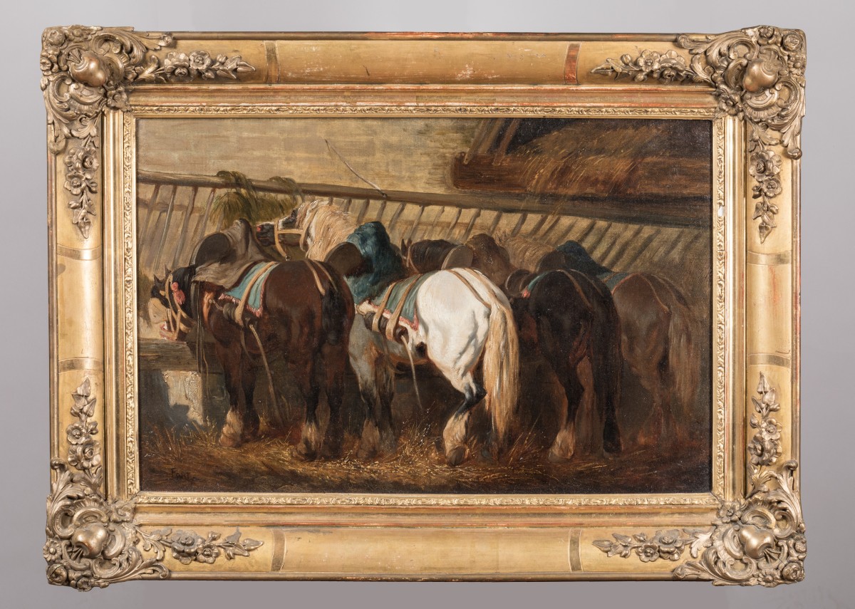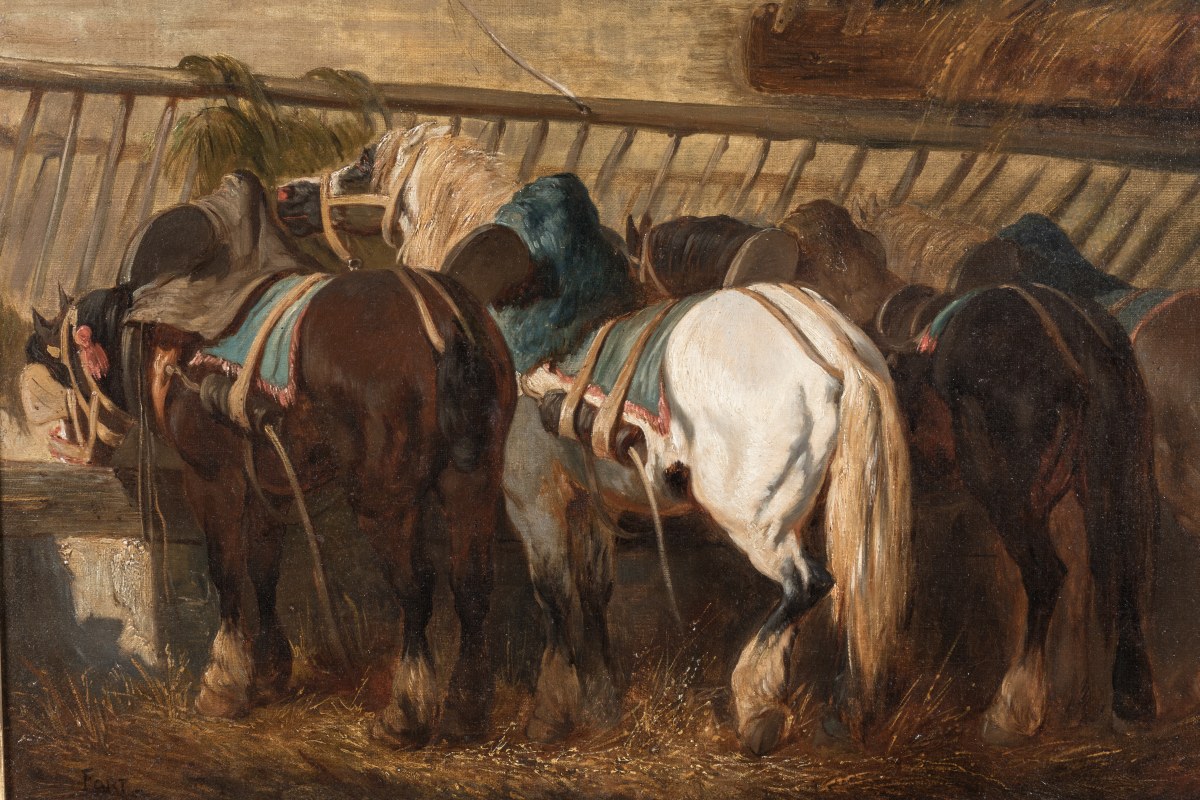 Débutant au salon de 1842, Théodore Fort se spécialise dans les sujets militaires où le cheval joue un rôle essentiel (Benezit). Aquarelliste de talent, il montre avec cette paire d'huiles sa maîtrise de la technique et des sujets, représentant le même groupe de chevaux au travail, sur un chemin de halage (ou au gué?) puis à l'écurie. Les cieux tourmentés du paysage contrastent avec l'éclairage à la bougie de la scène d'intérieur, montrant l'attachement du peintre aux leçons romantiques d'un Géricault, dont un groupe de chevaux à l'écurie -une composition proche de la nôtre- s'est vendue en juin 2016 au château d'Artigny.