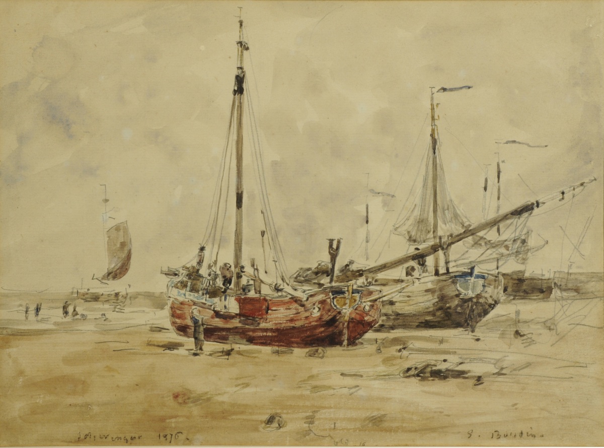 Boudin. Boats stranded. Watercolor signed and dated 1876.