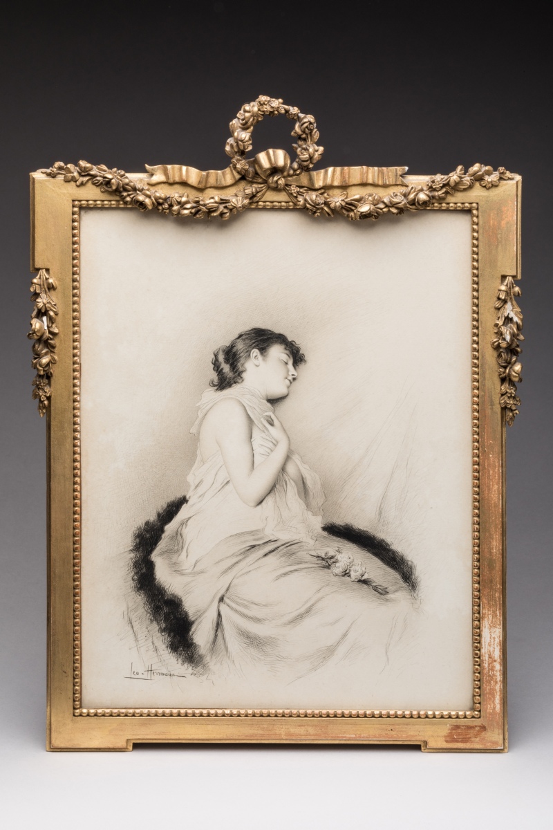 Léo HERMANN. Woman of a boa. Ink and stump. Signed lower left. Rich gilded frame.