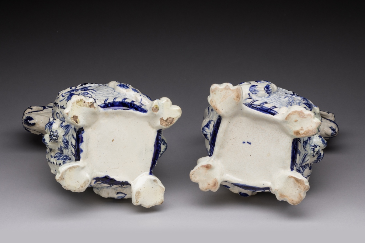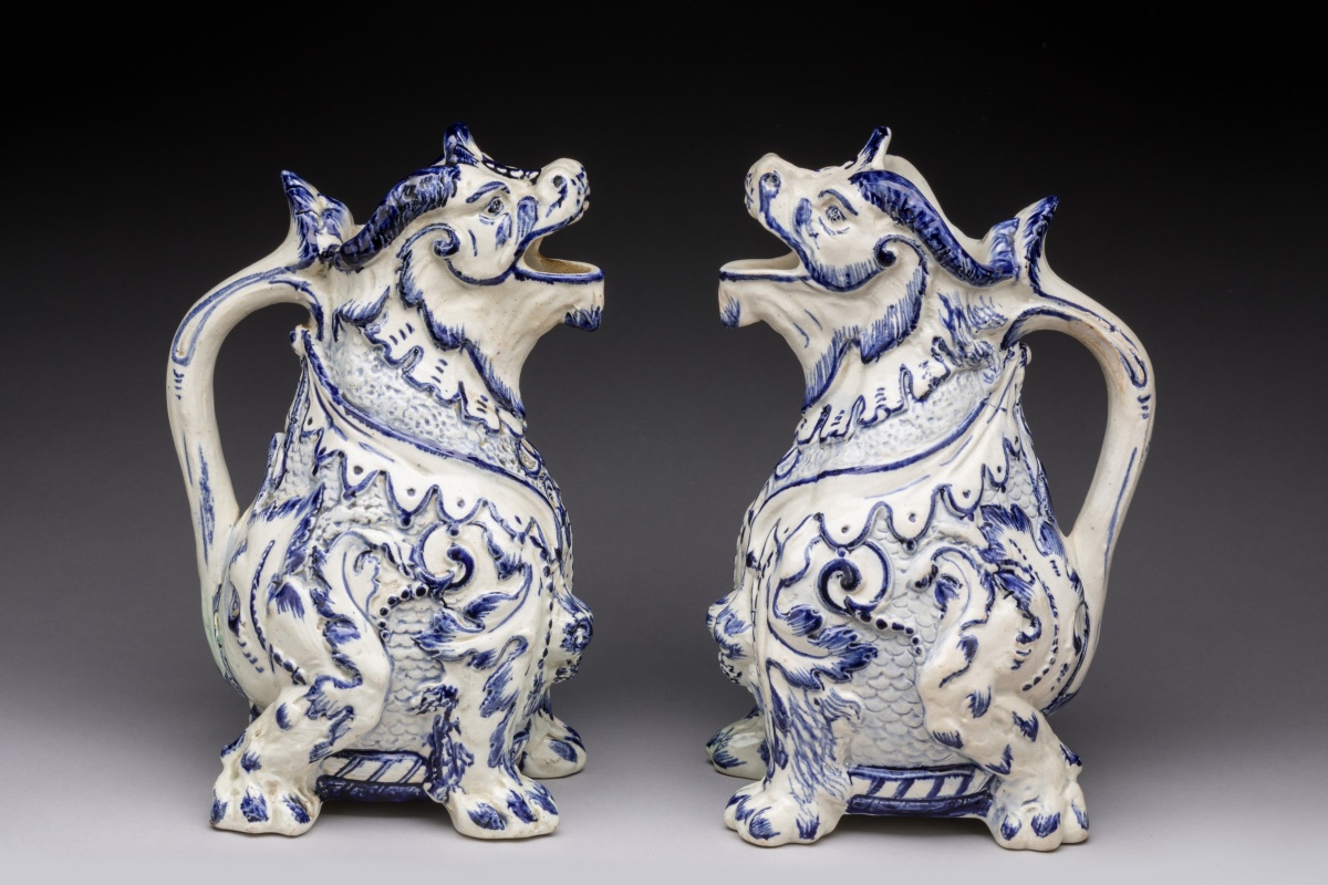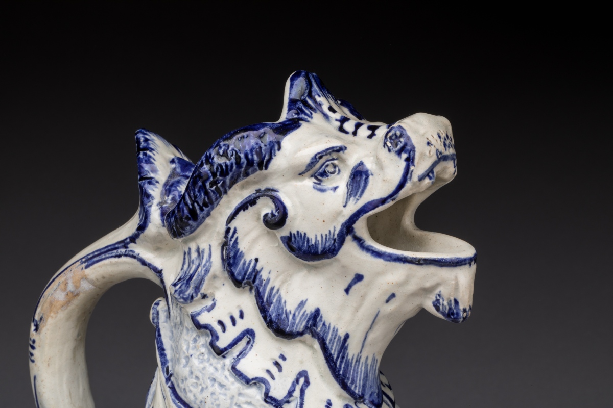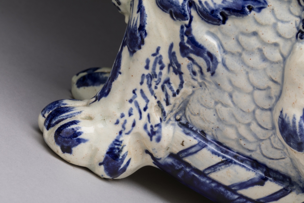 en faïence bleue et blanche. Le dragon assis sur ses quatre pattes recrache l'eau par sa gueule. Un collier pectoral est orné de fruits. La queue retournée forme l'anse.