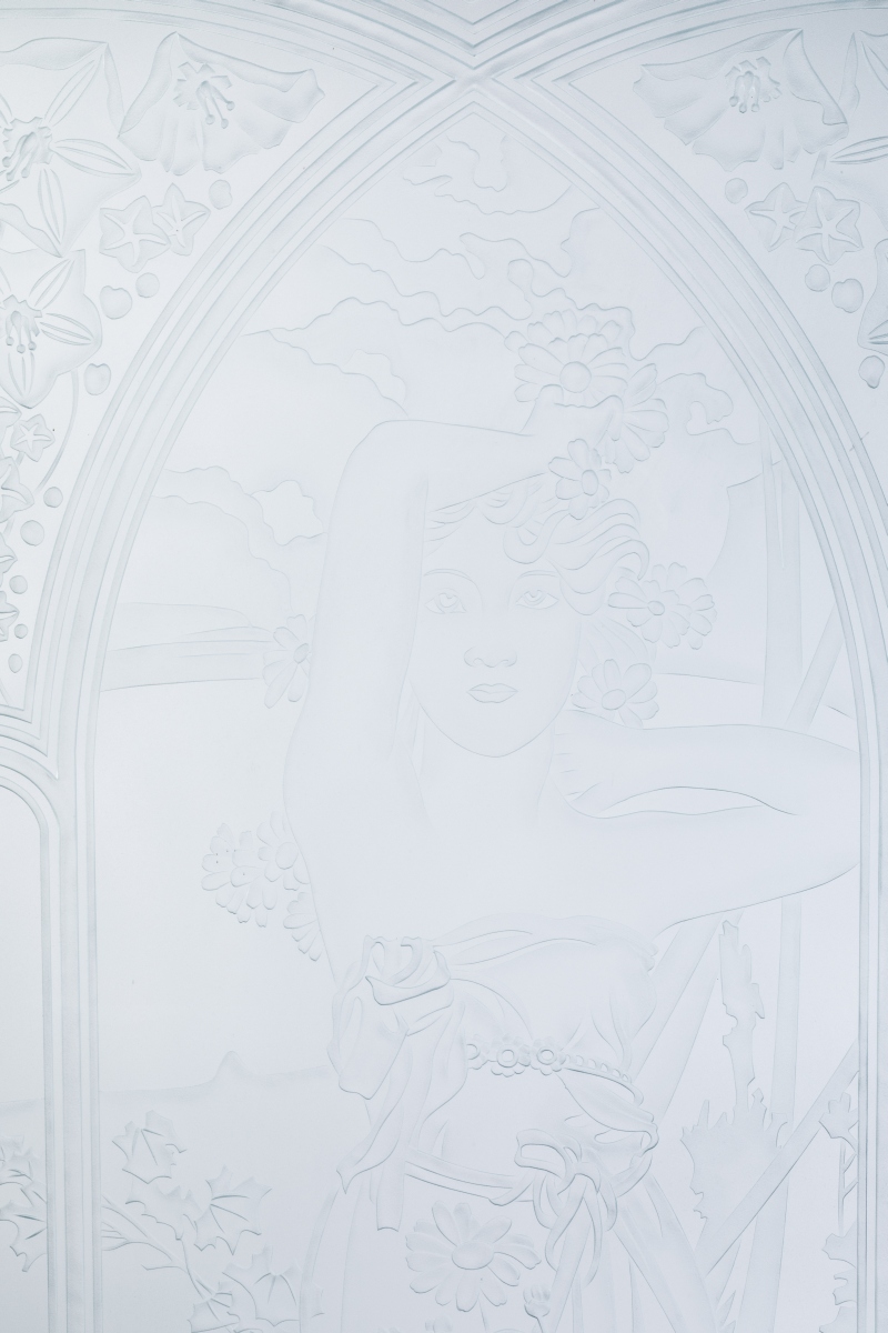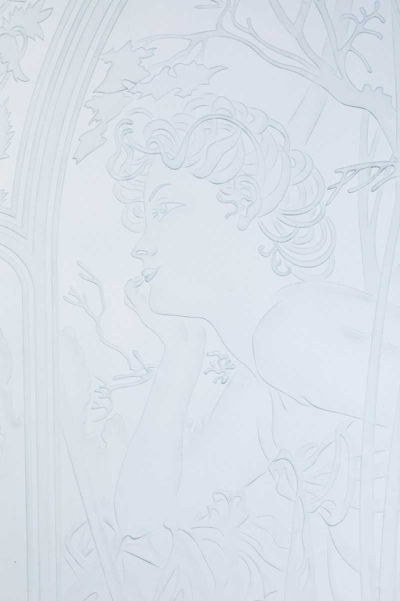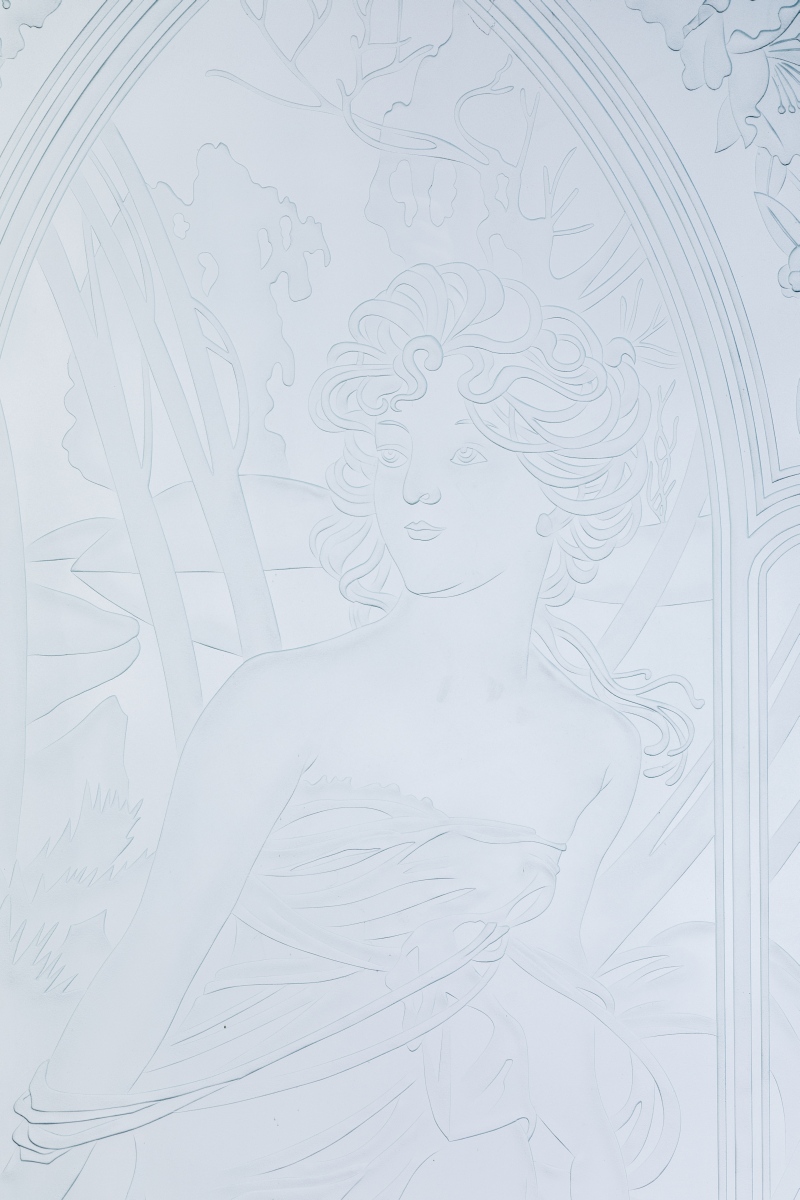 Quatre panneaux de portes en verre gravé et dépoli, figurant la série "les Heures du jour" comprenant "l'Éveil du matin", "l'Éclat du jour", la "Rêverie du soir " et le "Repos de la nuit ". Signés.