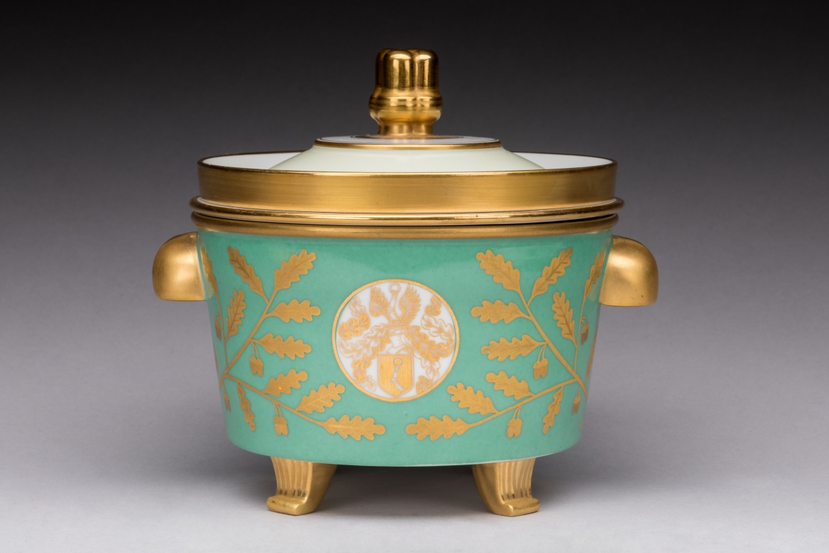 en porcelaine du service dit "de chasse". Décor or sur fond vert: filets, rameaux de chêne et armoiries personnelles timbrées d'un heaume. Le pot à caviar orné d'un médaillon figurant un coq de bruyère.