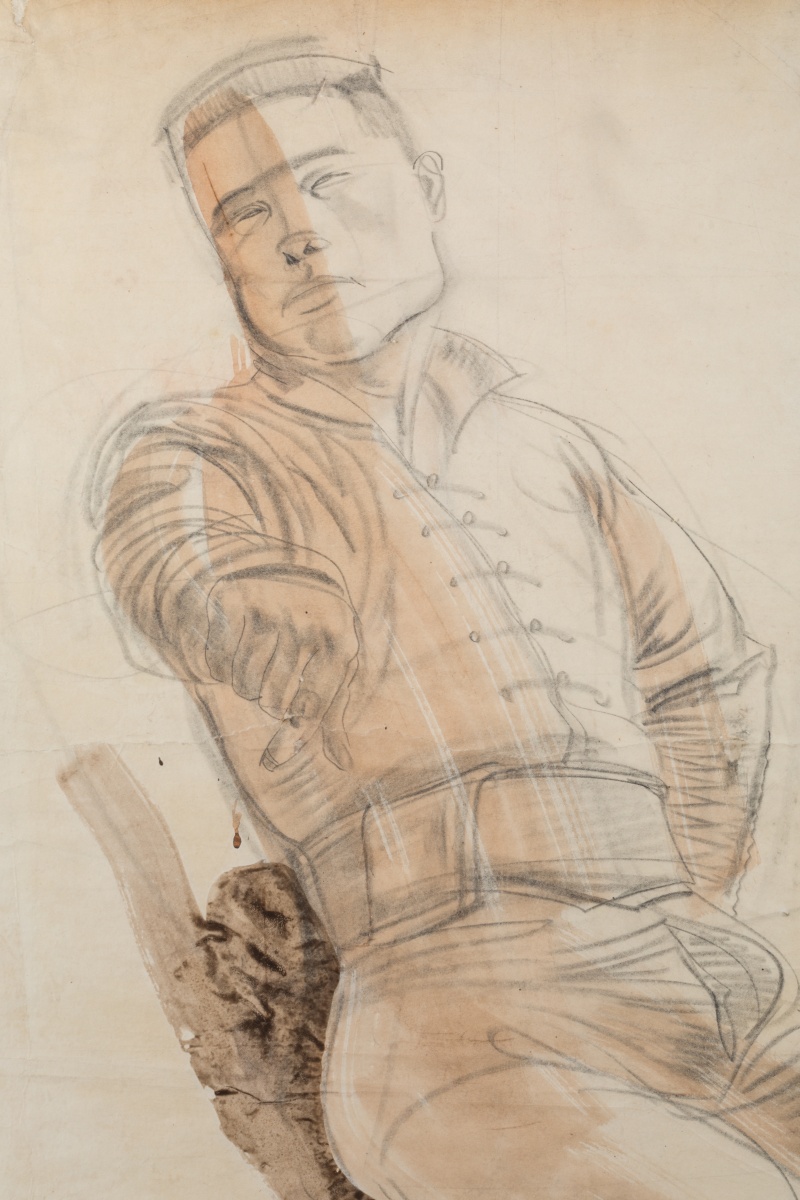Alexandre IACOVLEFF. Presumed portrait of chief from Pamir. Charcoal drawing, watercolour gouache. Two stamps lower right, including one from the whorkshop.