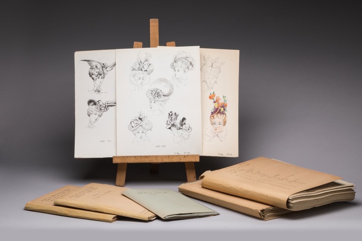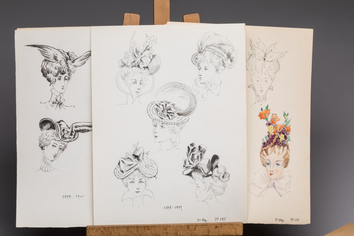 HISTORY of the FRENCH FEMALE HAIRSTYLING. MANUSCRIPT by Jeanne BESNARD-FORTIN, in two parts: 176 typed pages. And two parts of artworks (1.133 drawings and 39 watercolours).