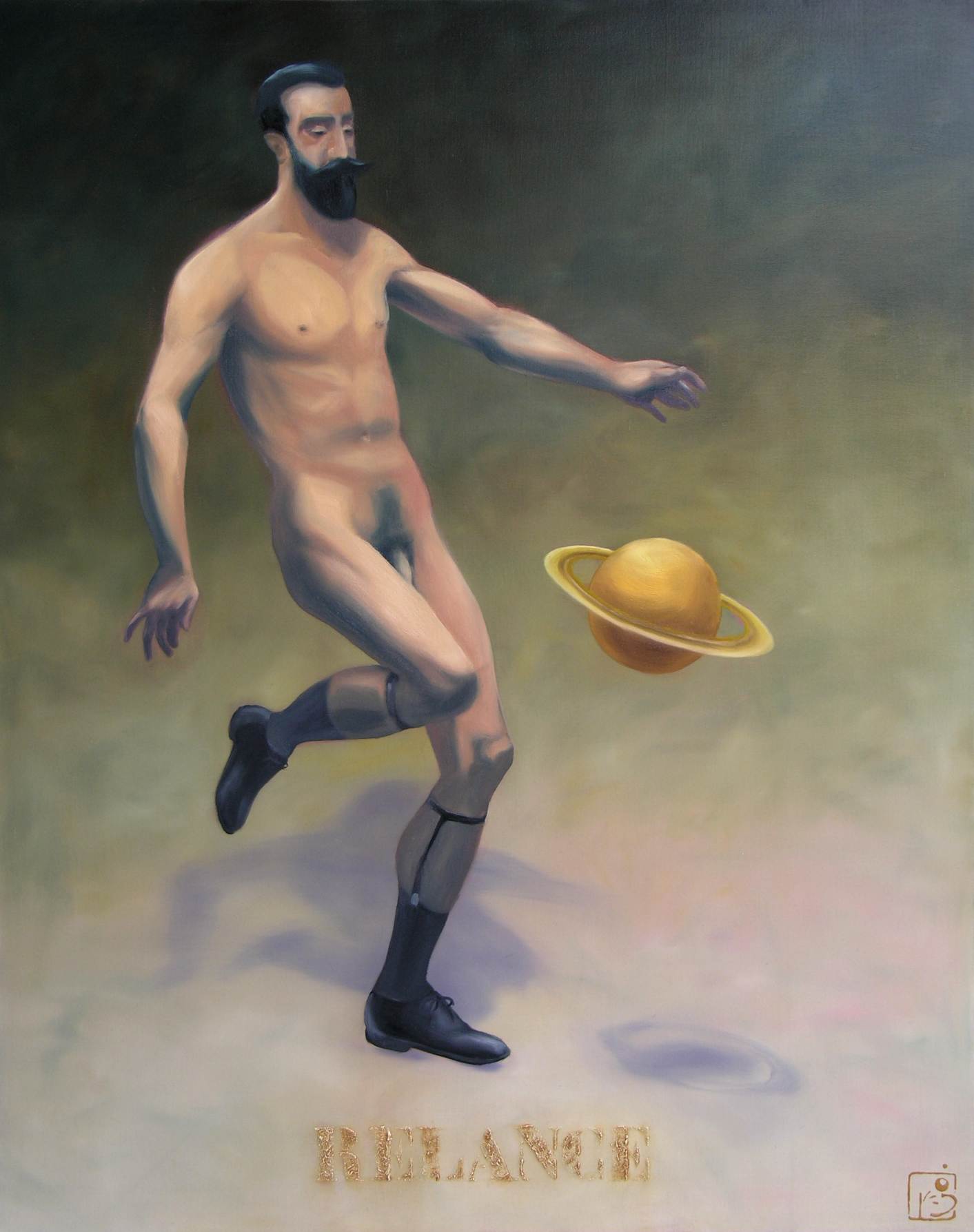 "Relance: étude anatomique d'après une chronophotographie d'Edward Muybridge. L'incongruïté du harnachement pédestre a engendré un glissement d'ordre fantastique vers le sidéral et le double sens, sabordant le sérieux d'une académie académique."