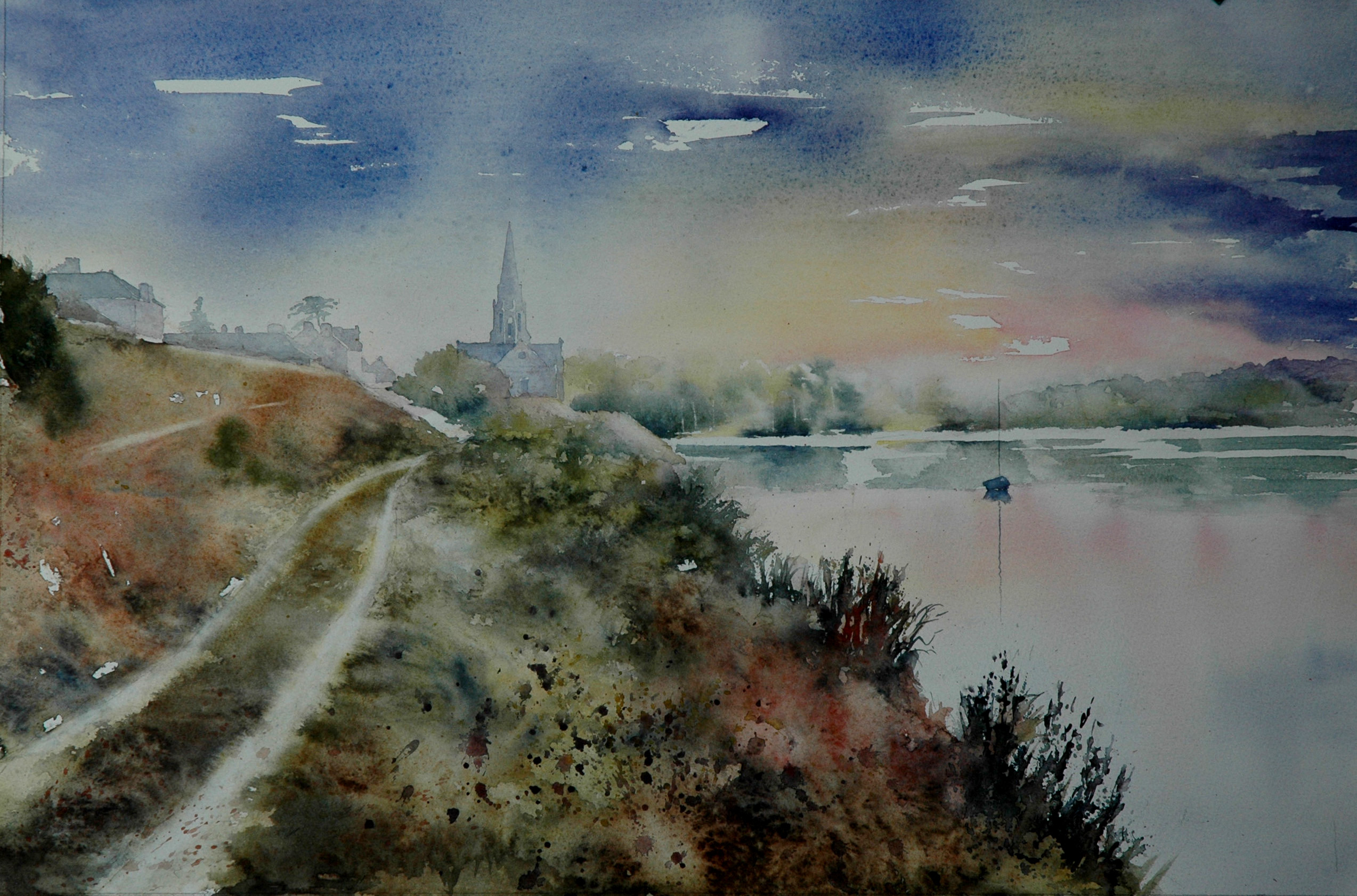 Dans l'aquarelle, je cherche à restituer des ambiances perçues souvent de façon éphémère dans la nature: luminosités diffuses de la brume matinale, teintes pastel du soleil levant, ou rougeoyantes au couchant, contrastes des ciels très chargés.
