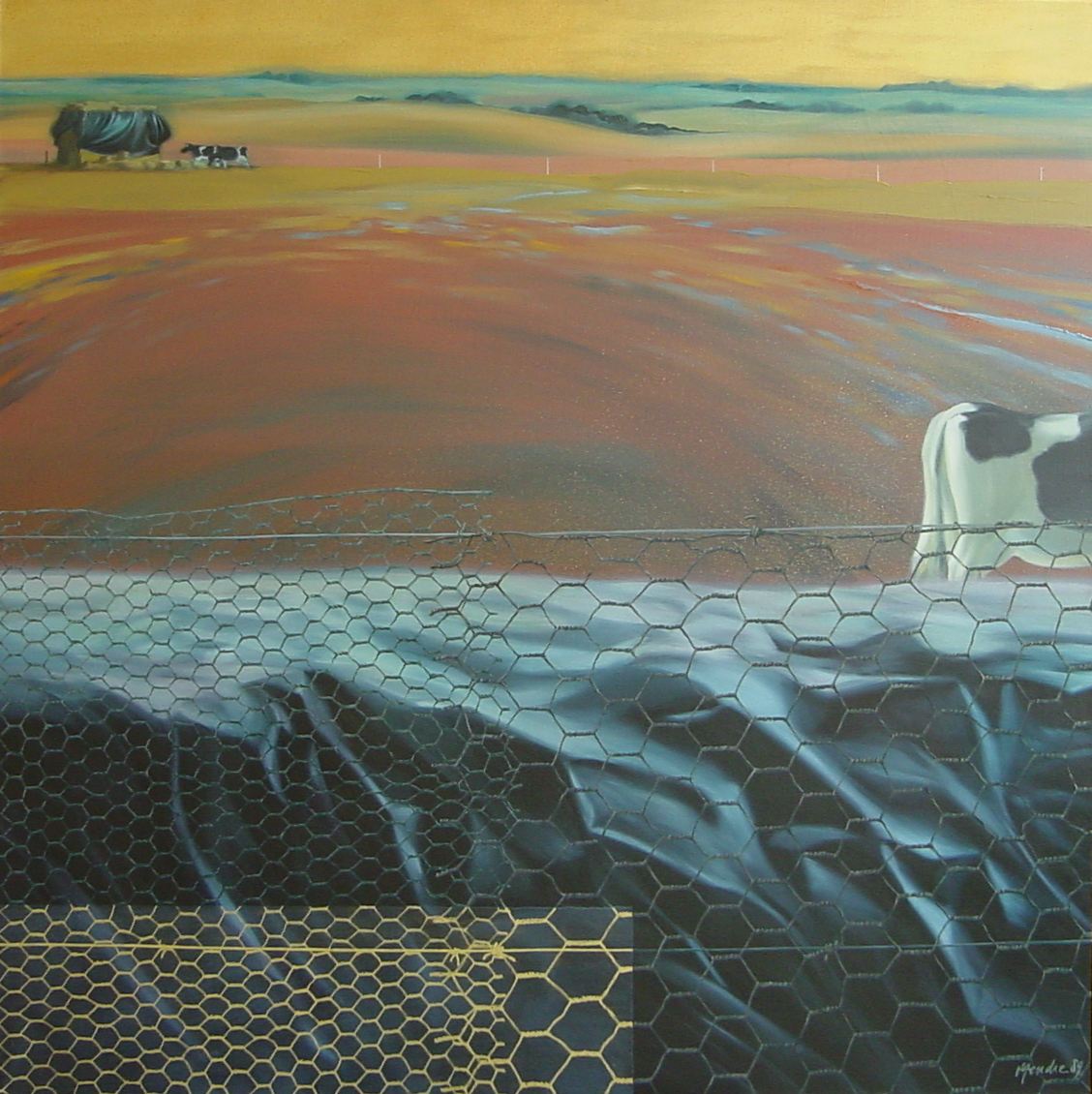 " Le champ de la peinture est brouté ici par les bovins qui s'esquivent dans la distance et le hors-champ, le spectateur ne peut entrer que virtuellement dans l'espace du peintre vu par delà un grillage qui s'affiche partiellement en pure illusion lumineuse , comme le ciel, l'or passant devant ou derrière juste par sa position. "