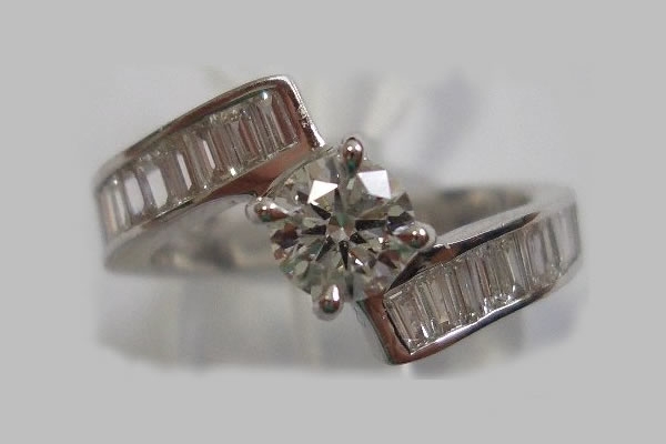 BAGUE en or blanc, ornée d'un DIAMANT blanc taille moderne d'environ 0,55 carat, agrémenté de 25 DIAMANTS blancs taille baguette d'environ 0,70 carat.