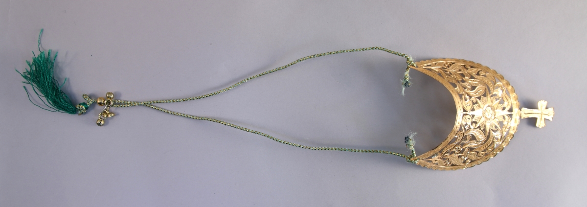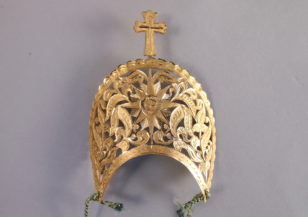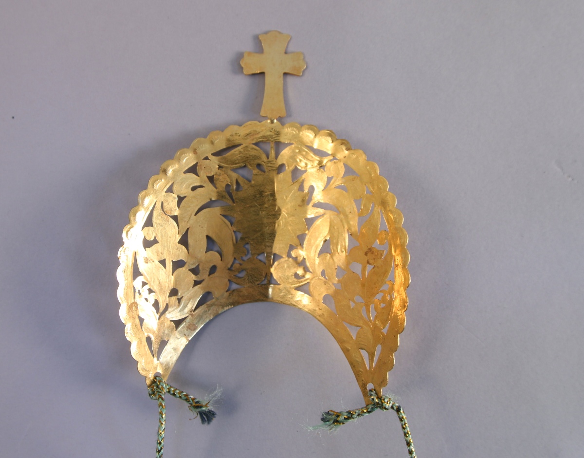 Petit DIADÈME DE STATUE en or jaune mat et bruni à décor ajouré de feuillages et d'une rose des vents centrée d'une croix virgulée. Une croix à l'amortissement. Travail étranger.