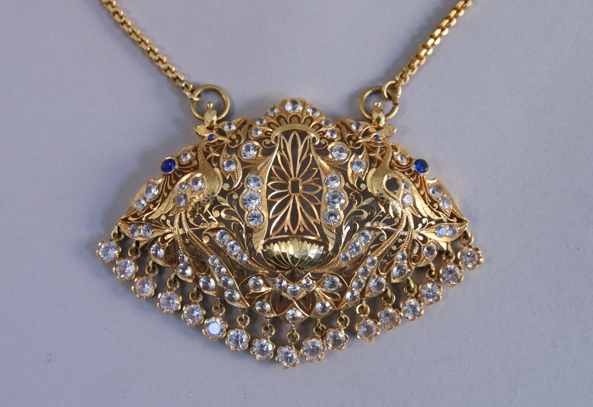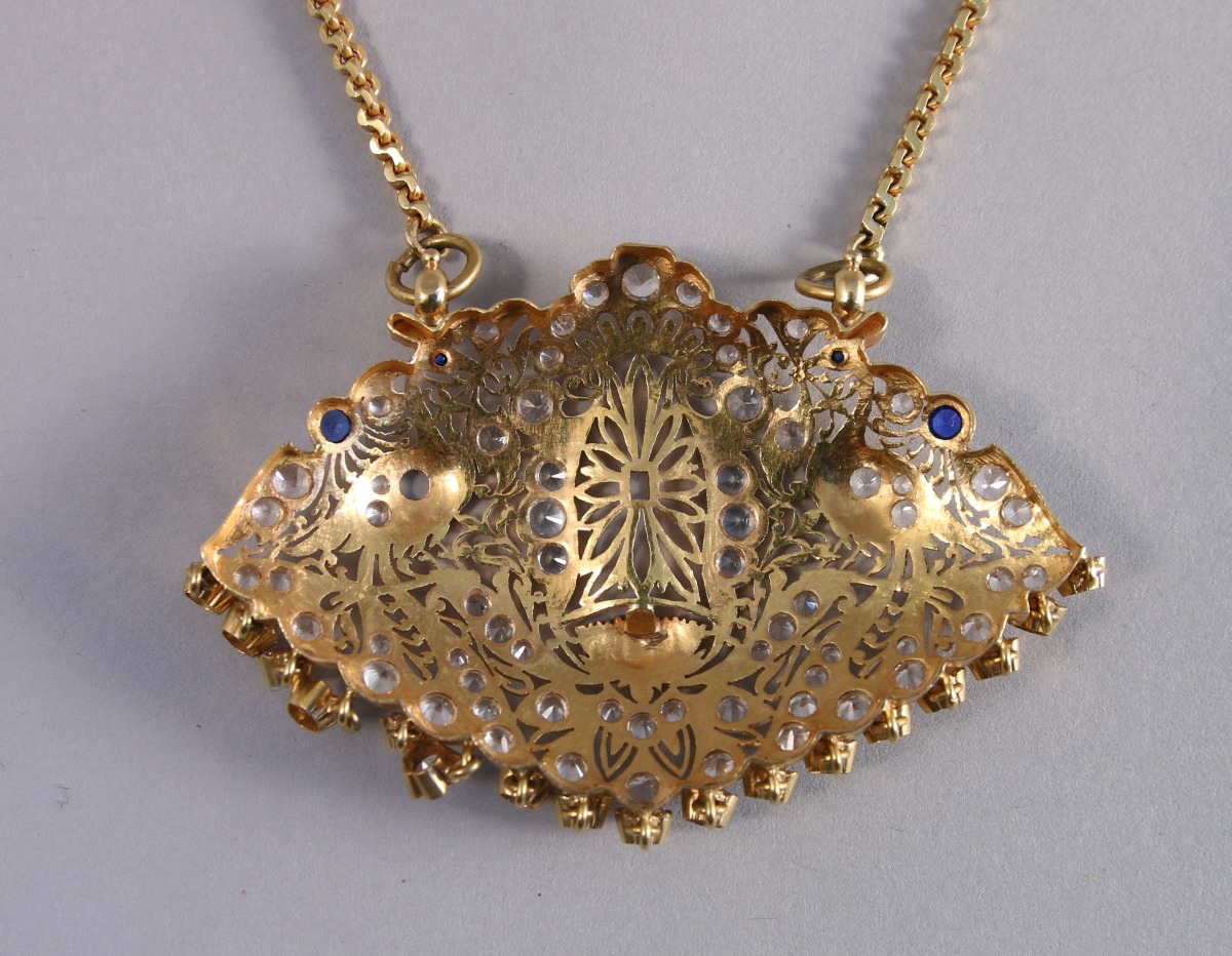 COLLIER en or jaune retenant un important pendentif pectoral de forme oblongue serti de pierres blanches et bleues à décor ajouré de deux oiseaux dans des motifs feuillagés. Une niche souligné d'une fleur de lotus au centre. Chaîne maille vénitienne. Travail étranger.