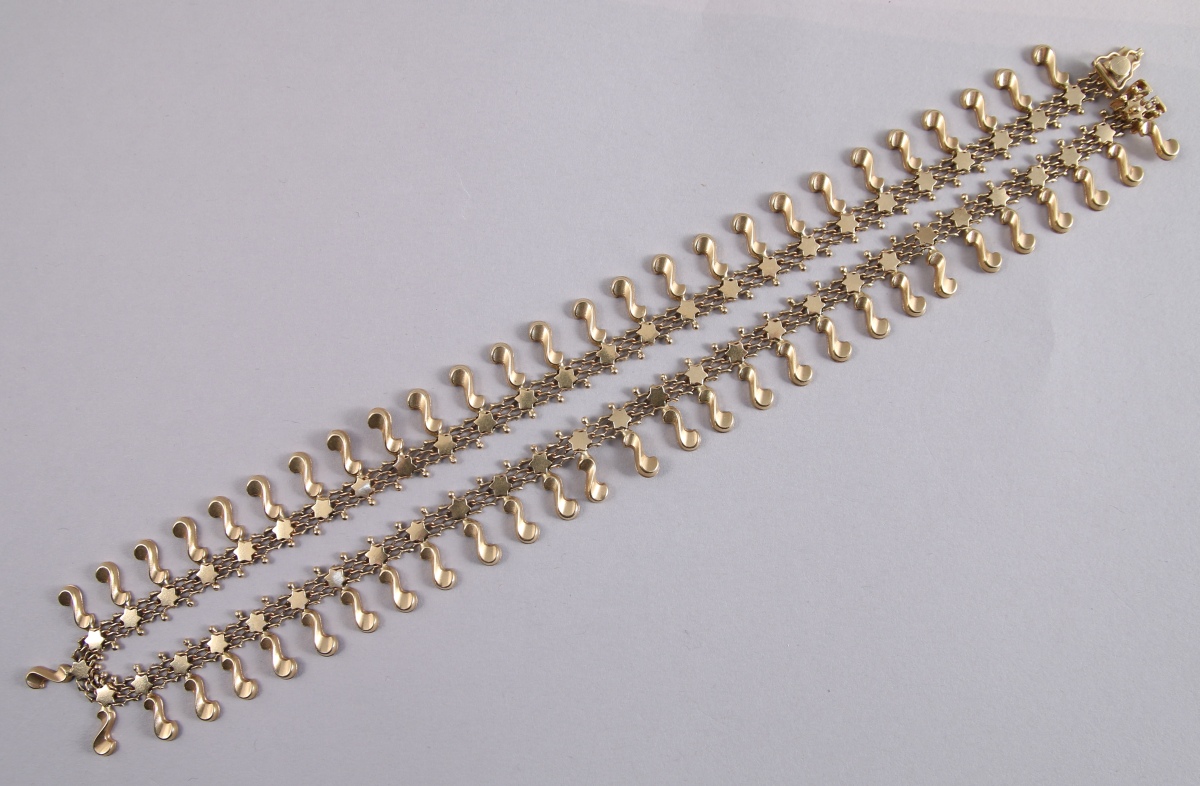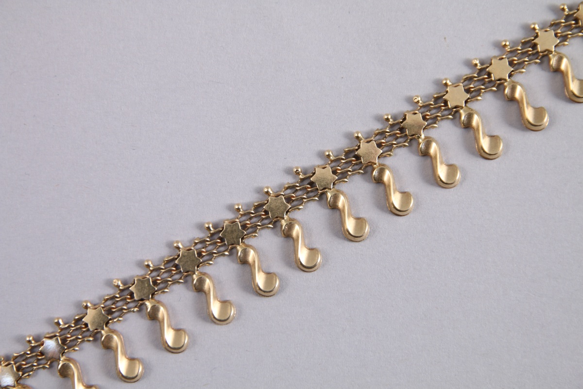 COLLIER en or jaune 18K. Maille articulée à décor d'étoiles de David et pendeloques en console. Travail étranger.