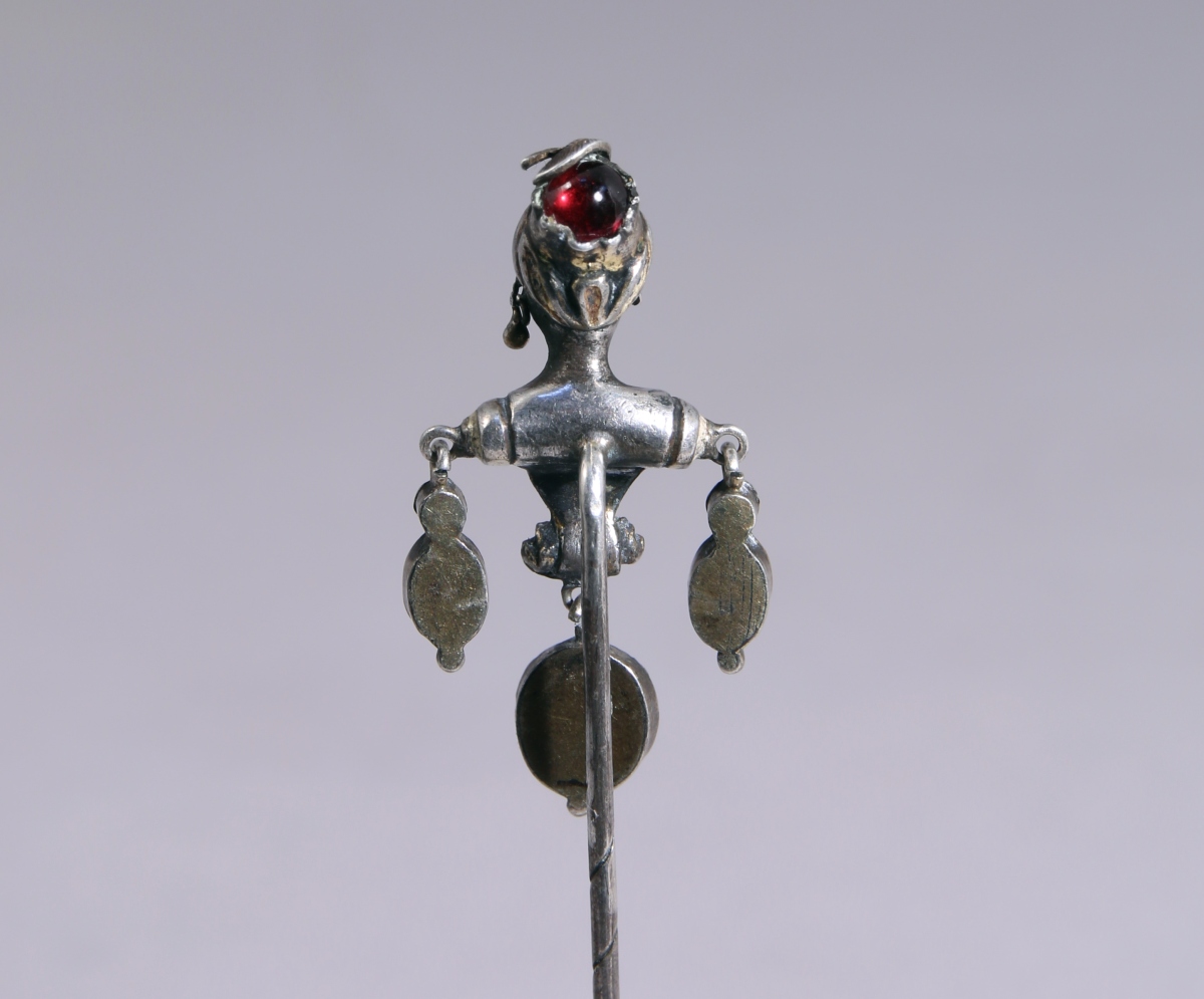 ÉPINGLE À CRAVATE figurant un buste de Nubienne en argent et partiellement en vermeil. Son turban empanaché en orné d'un grenat et d'une turquoise. Pierres que l'on retrouve retenues en 2 pendeloques et au niveau du buste. Elle est en outre parée d'une boucle d'oreille. Les côtés du buste, ainsi que les creux du turban, présente des traces d'émail.