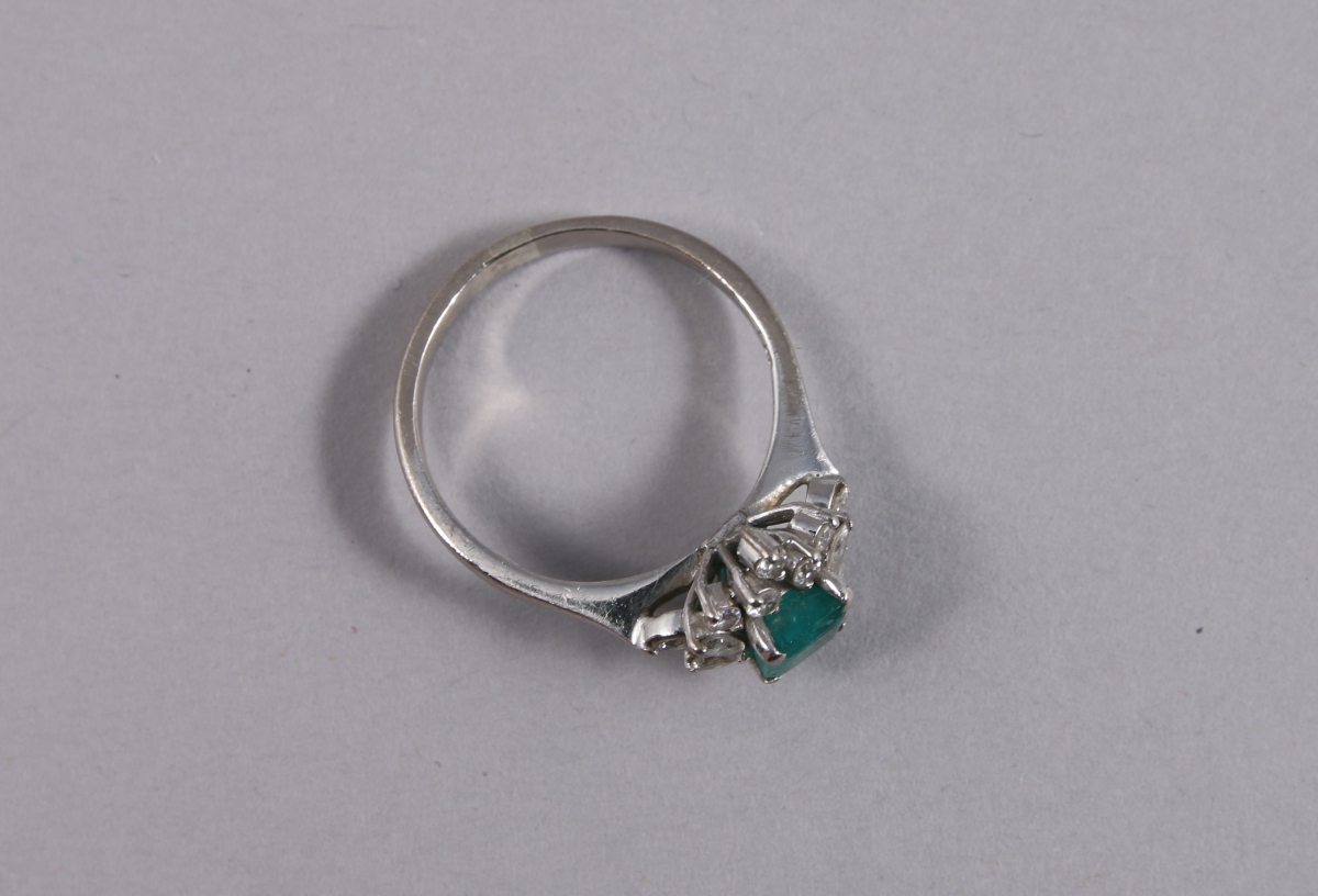 BAGUE marguerite en or gris 14K sertie d'une ÉMERAUDE taille émeraude dans un entourage de 16 petits DIAMANTS, dont six taille navette.