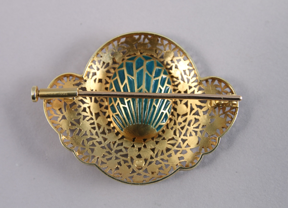 BROCHE en or jaune 18K figurant Notre-Dame de Lourdes dans une niche émaillée bleu à l'imitation du vitrail. Encadrement finement ajouré de feuillages appliqués de roses épanouies. La tranche gravée "15-8-1958 / -A-BOTTAZZI- / NOSTRA SIGNORA DI LOURDES / RENONE MARIUCCIA".