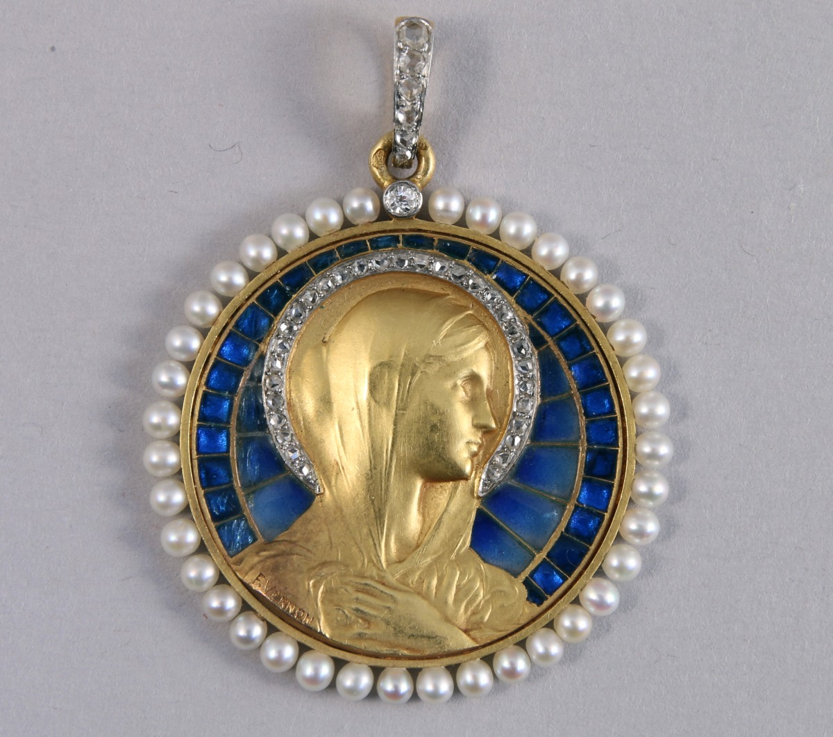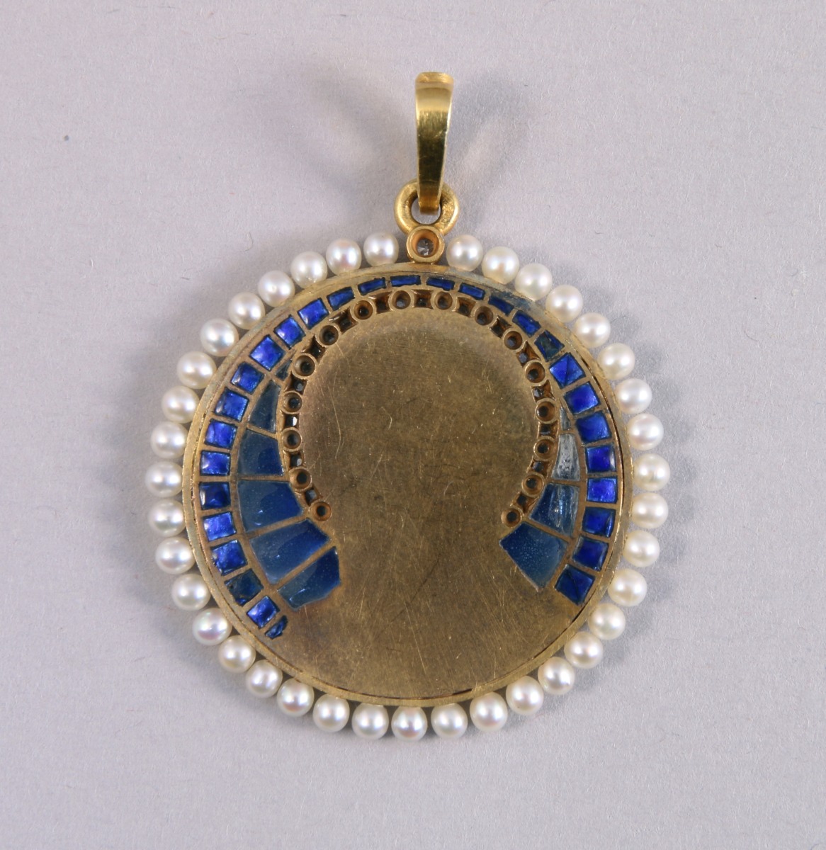 MÉDAILLE en or jaune 18K figurant la sainte Vierge de profil dans un encadrement en émail "plique-à-jour" bleu à l'imitation du vitrail. La médaille est cerclée de perles. L'auréole et la bélière sont serties de petits brillants. Poinçon tête d'aigle.