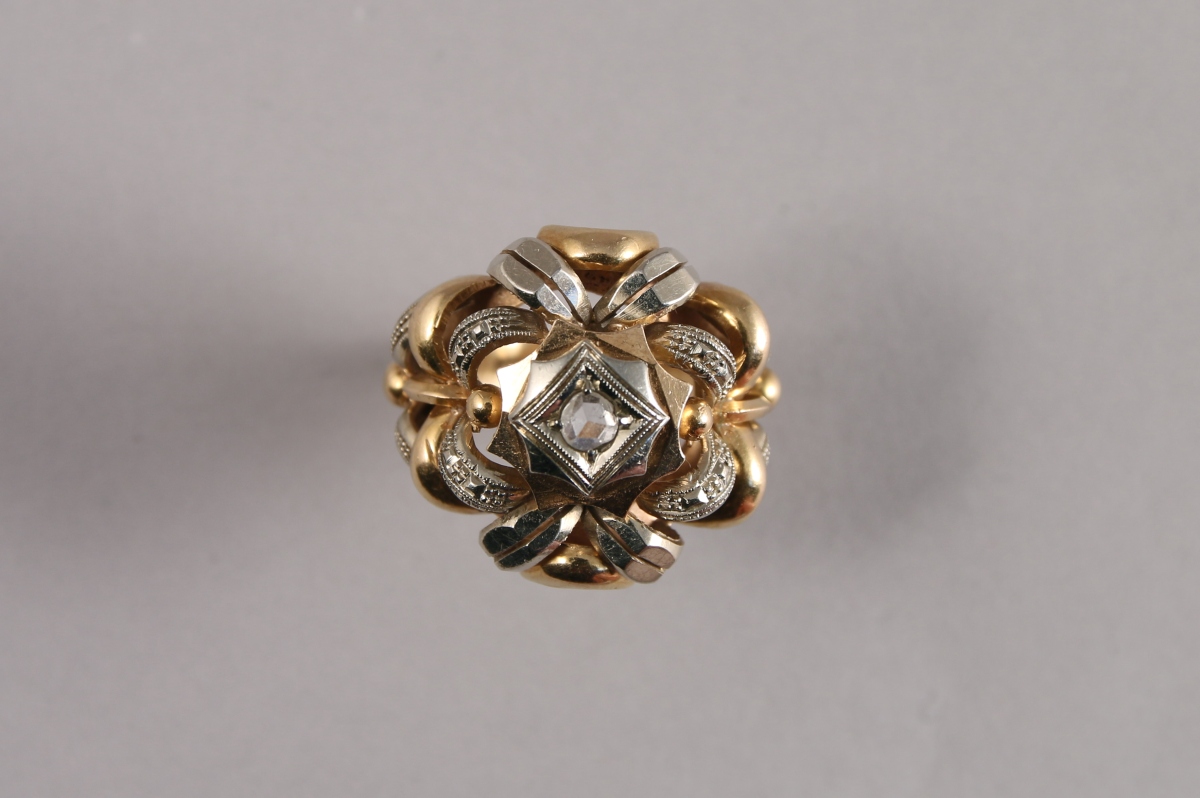 BAGUE en or jaune et gris 18K. Important chaton ajouré de motifs arqués centré d'un DIAMANT taille rose.