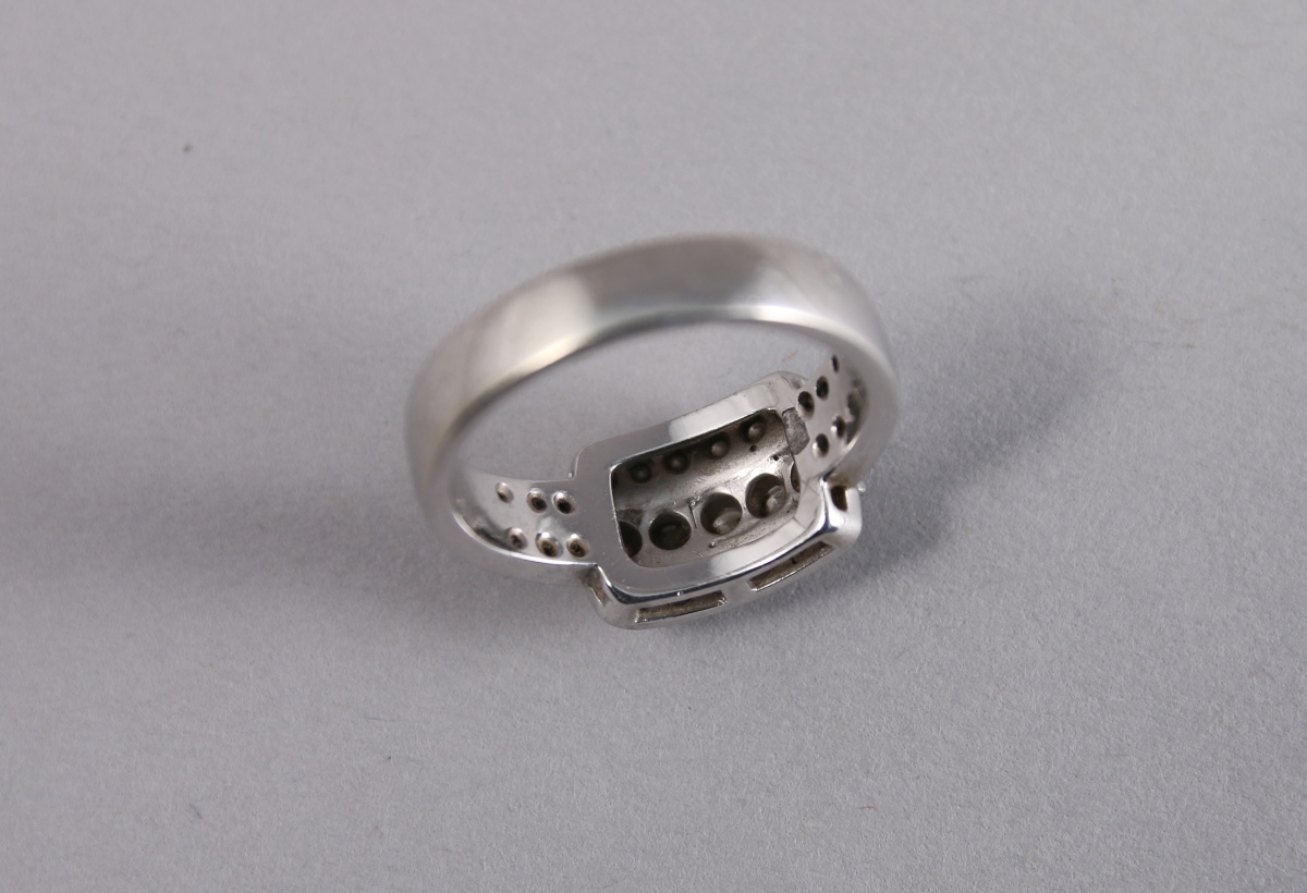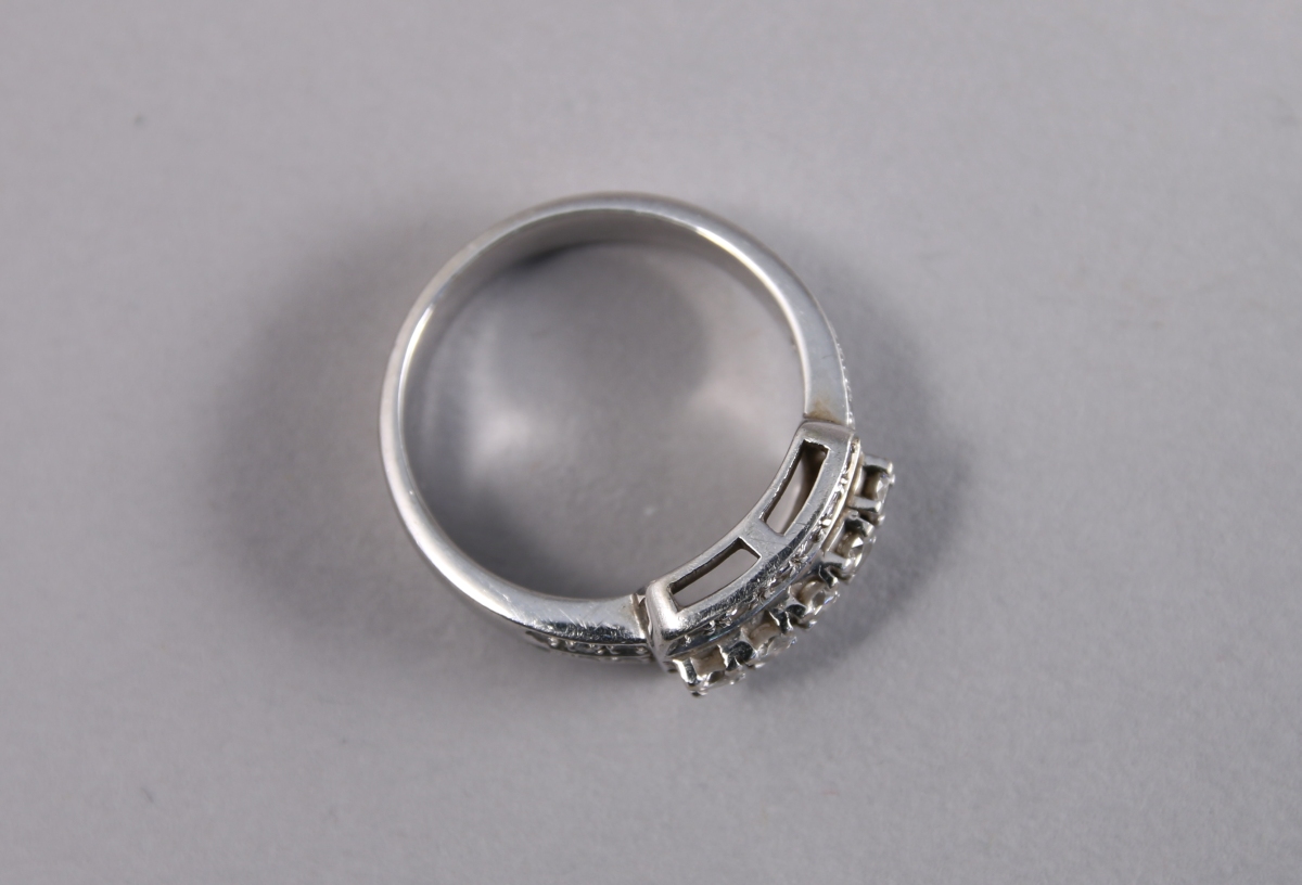 BAGUE en or gris 18K sertie de 29 BRILLANTS. Cinq plus importants sont placés en ligne au centre. TDD: 55. Poids brut: 6,5 g.