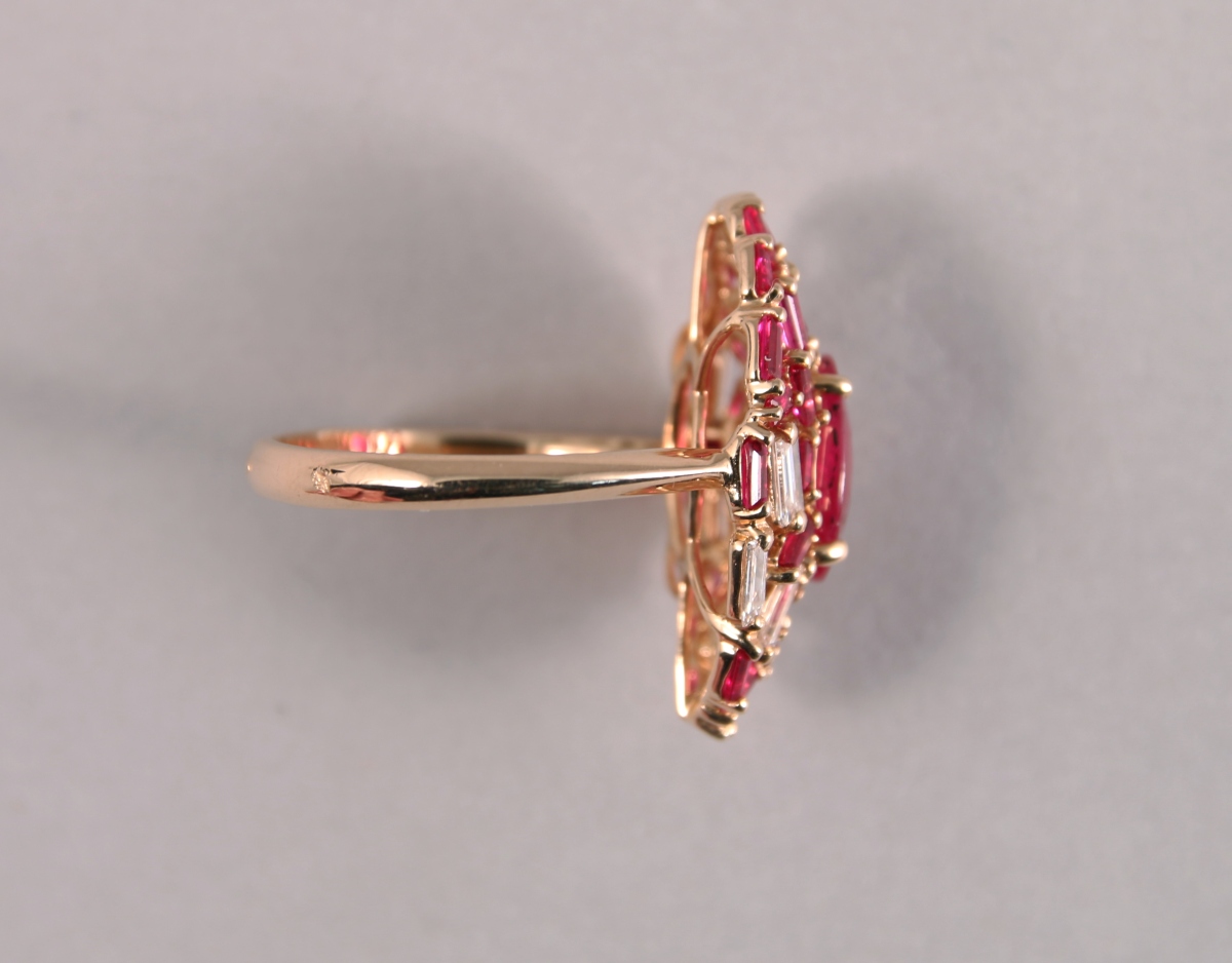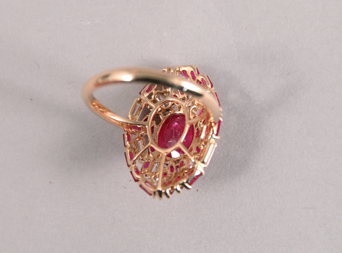 BAGUE ovale Design en or rose, au centre un RUBIS taille ovale d'environ 2,27 carats agrémenté de huit DIAMANTS blancs taille baguette d'environ 0,55 carat et de 33 RUBIS taille baguette d'environ 1,35 carat.