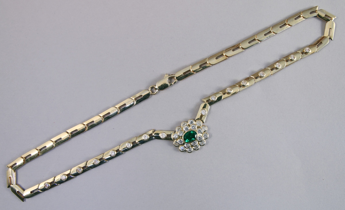 COLLIER en or jaune 18K à maillons articulés sertis d'une pierre blanche pour 16 d'entre eux. Il retient un motif type Pompadour centré d'une pierre verte taille ovale dans un double entourage de 12 pierres blanches.
