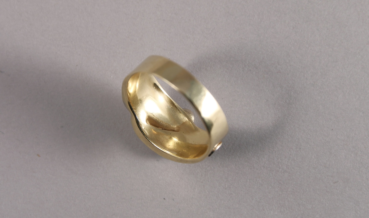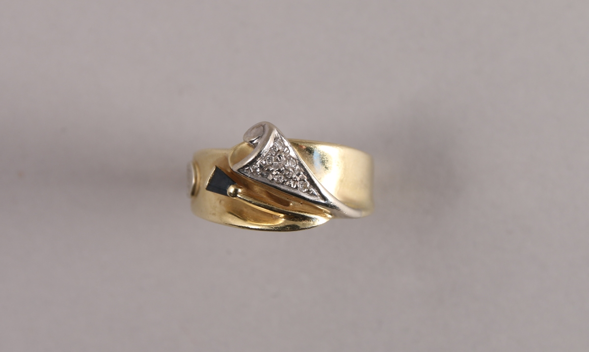 BAGUE en or jaune 18K orné d'un motif floral en léger relief serti de six BRILLANTS et d'un SAPHIR calibré de forme trapézoïdale.