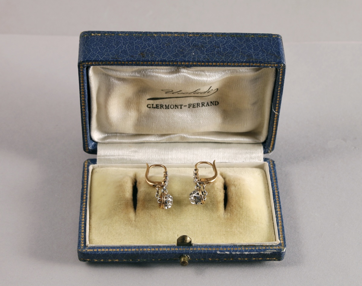 Paire de BOUCLES D'OREILLE en or jaune et blanc retenant en pendant un petit DIAMANT. La boucle est en outre orné de trois petites pierres blanches