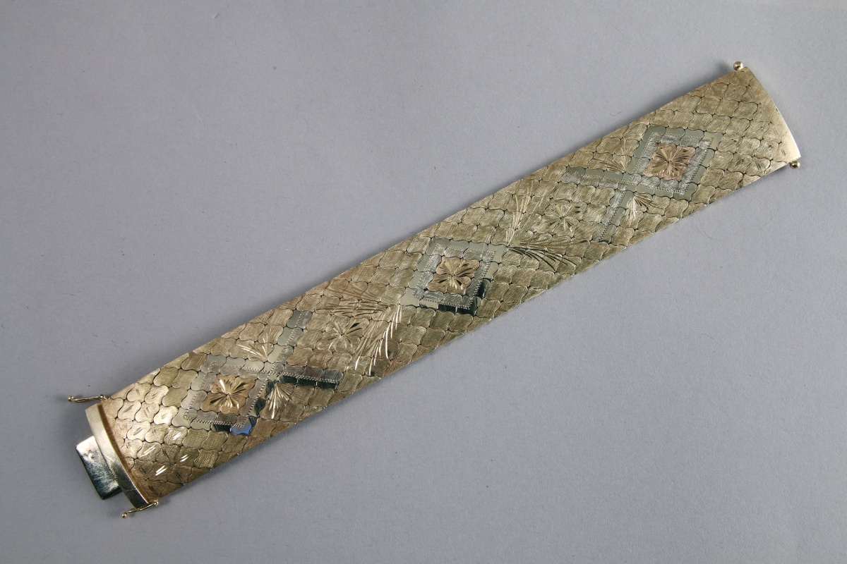 BRACELET MANCHETTE, maille écaille, en or 18K. Sur fond en or jaune amati, il est orné de trois motifs de forme losangique en or gris centrés d'un fleuron en or rose. Il est en outre gravé de gerbes stylisés.