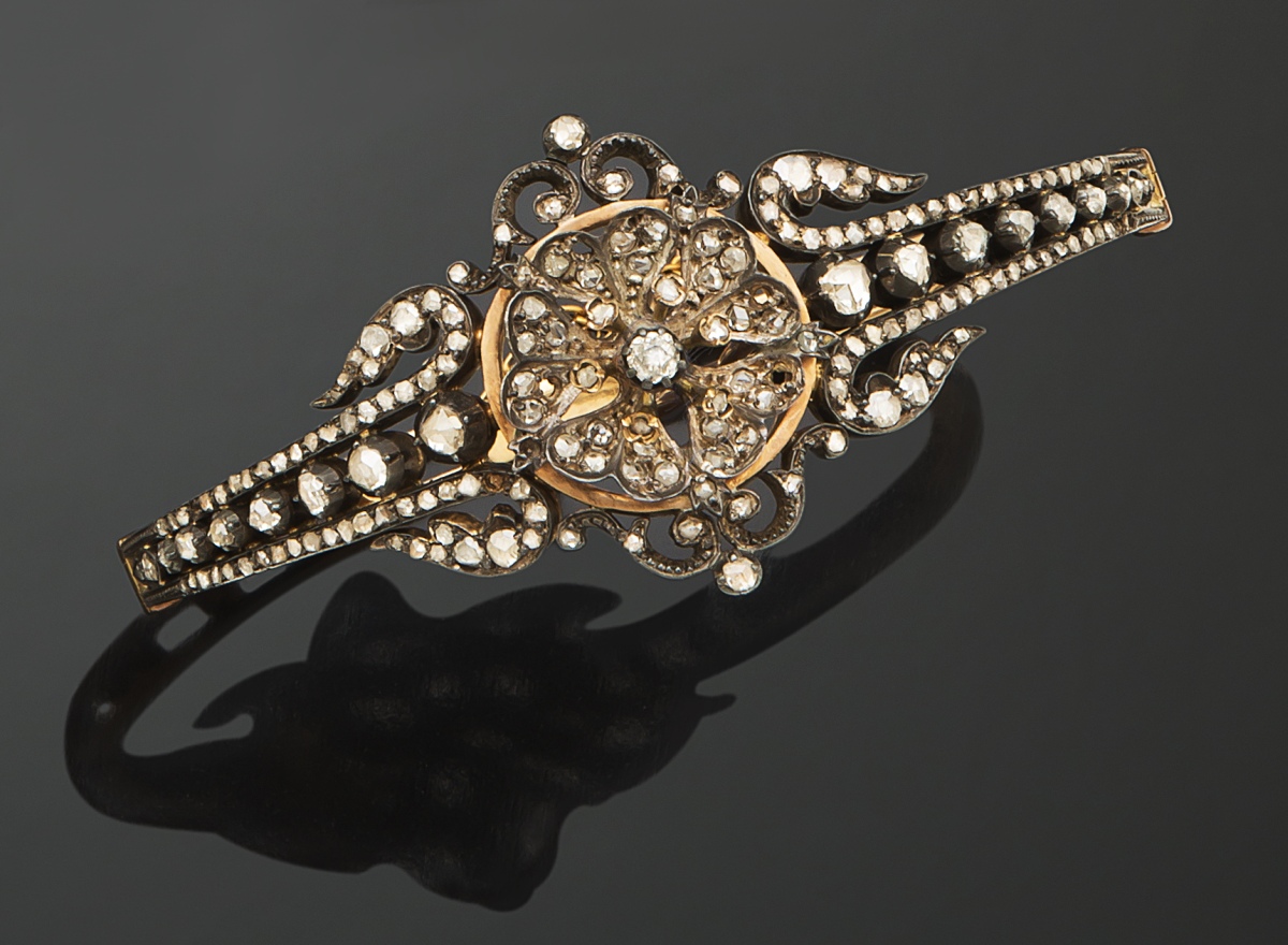 BRACELET rigide ouvrant, en or jaune 750 millièmes et argent 925 millièmes, le centre à décor de fleur orné de lignes de DIAMANTS taillés en rose et de taille ancienne, un plus important.