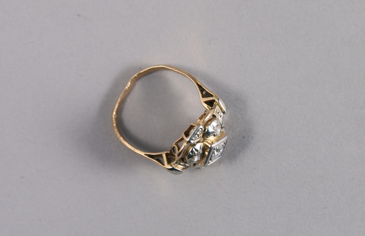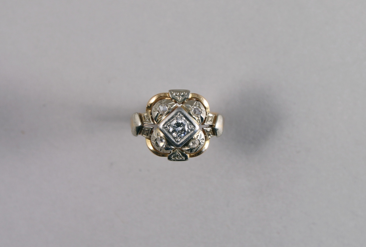 BAGUE en or jaune 18K ornée en son centre d'un DIAMANT demi taille d'environ 0,2 ct (A PRECISER) dans un entourage de quatre petits DIAMANTS dans des lobes.