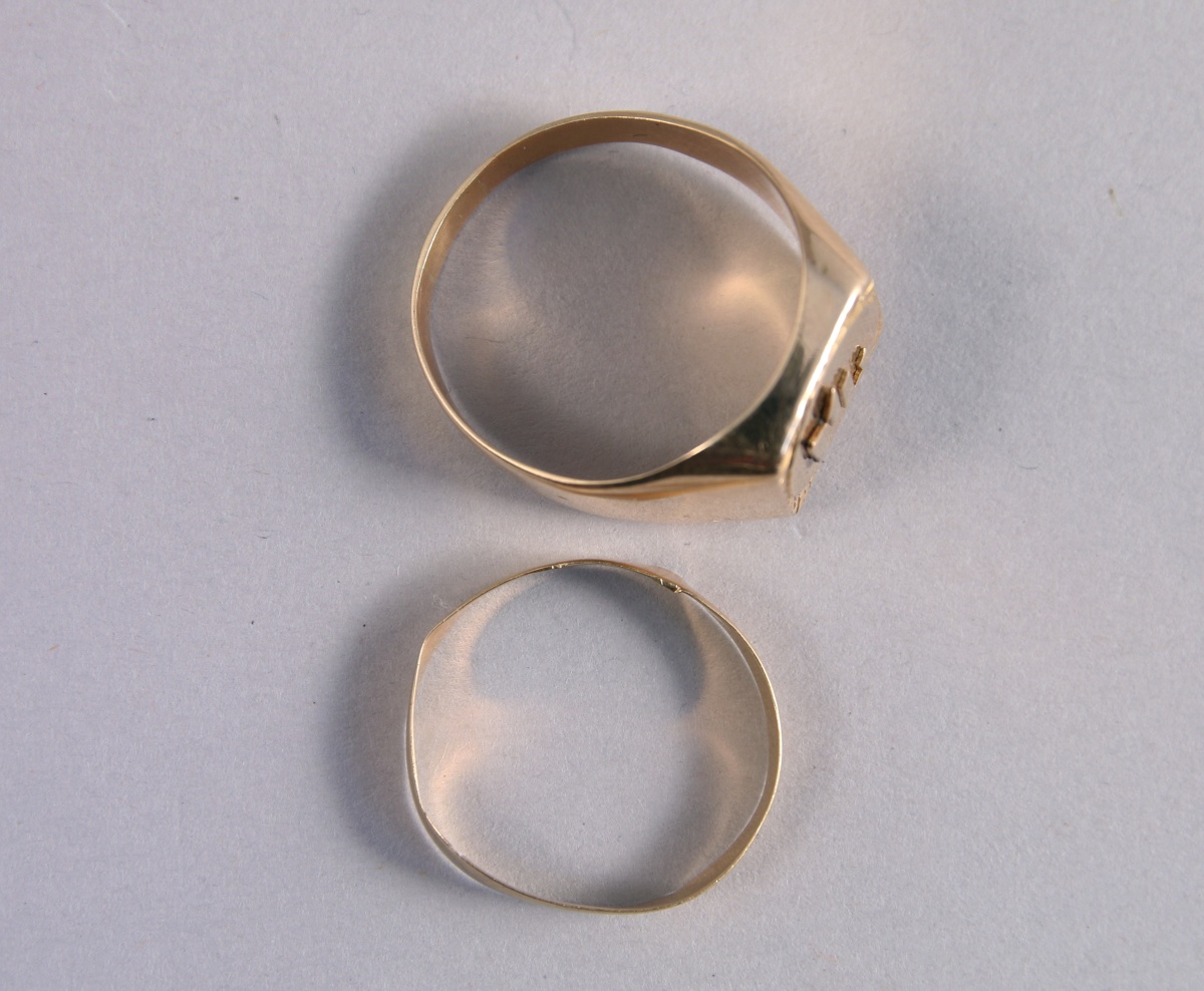CHEVALIÈRE en or jaune 18K, le chaton monogrammé ML sur un fond guilloché (TDD 65) et une ALLIANCE en or jaune 18K (TDD 59).