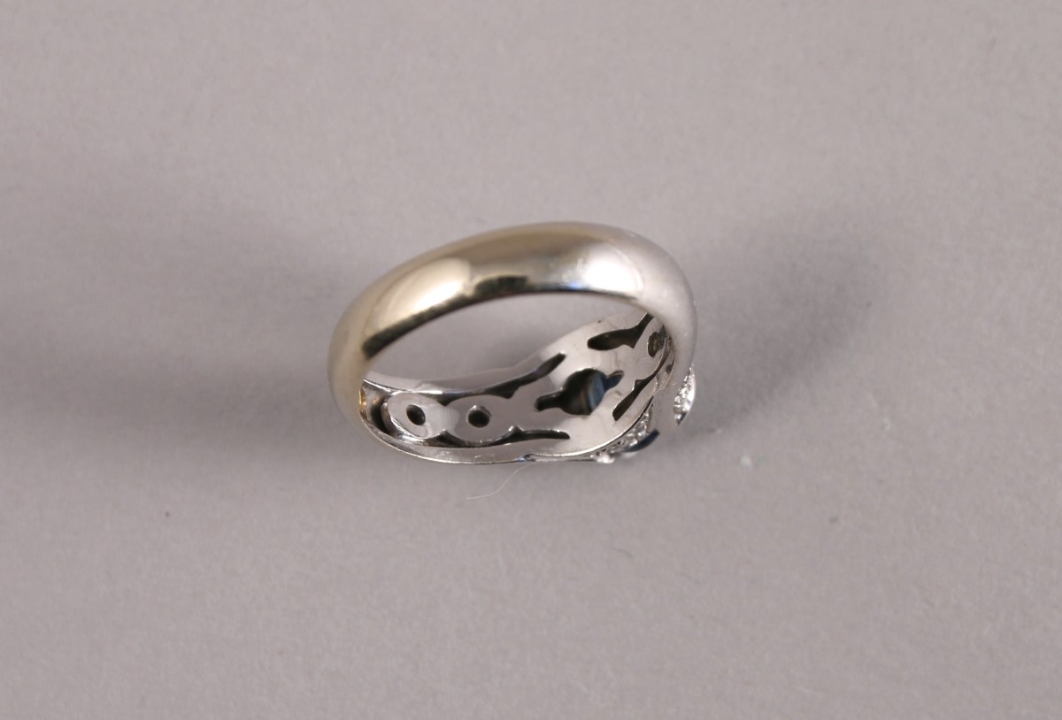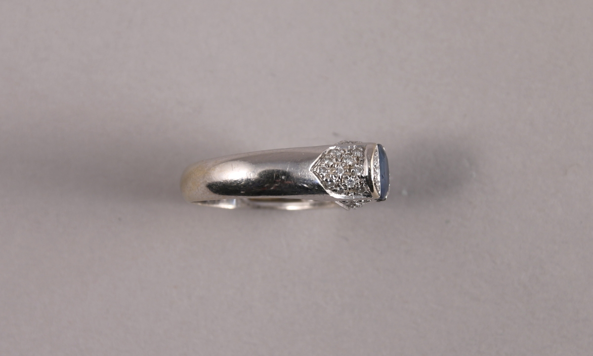 BAGUE en or gris 18K sertie d'un SAPHIR taille ovale. Le chaton et l'épaulement pavés de 36 BRILLANTS.