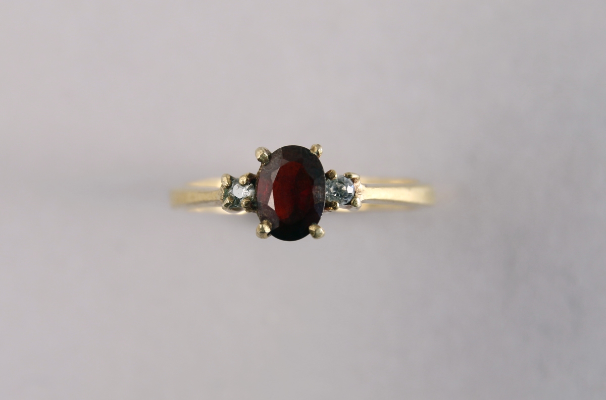JOINT: BAGUE en or jaune (travail étranger) ornée d'un rubis (?) entouré de deux petits brillants.