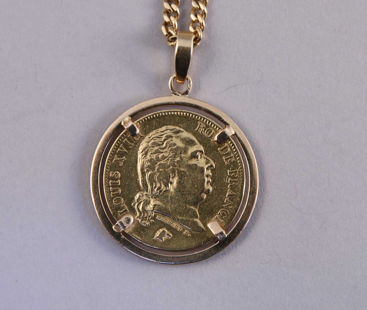 Important PENDENTIF en or jaune 18K orné d'une pièce de 40 FRANCS OR (Lille, 1818) au profil de Louis XVIII par Auguste-François Michaut.