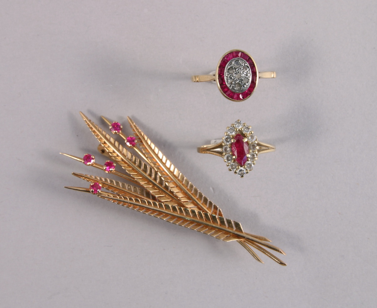 Les BAGUES: l'une ornée en son centre d'une pierre rouge (RUBIS?) taille navette dans un entourage de brillants, l'autre pavée en son centre d'un cercle de brillants dans un entourage de pierres rouges (RUBIS?). Tour de doigt 53. poids brut 5,7 g.