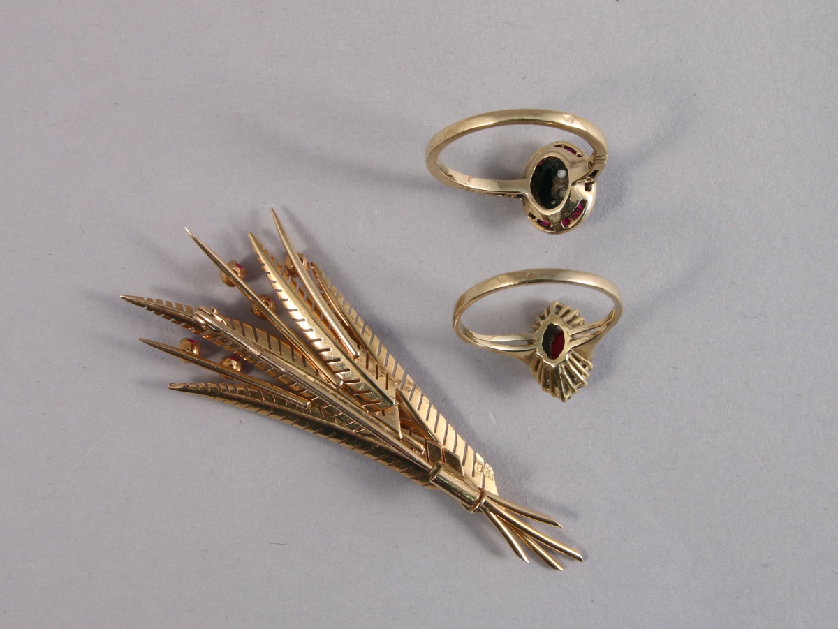 2 BAGUES et une BROCHE en or jaune 750 millièmes: