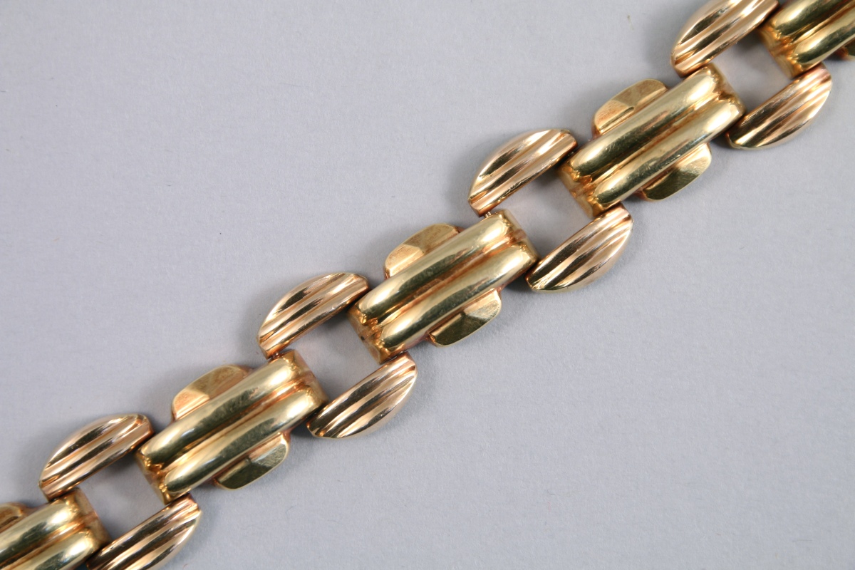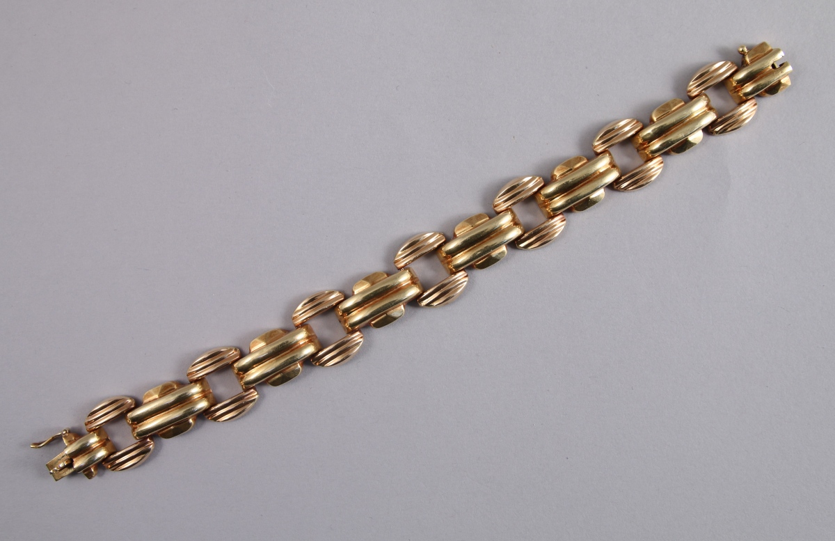 BRACELET TANK en or jaune 18K. Mailles creuses articulées. Travail étranger.