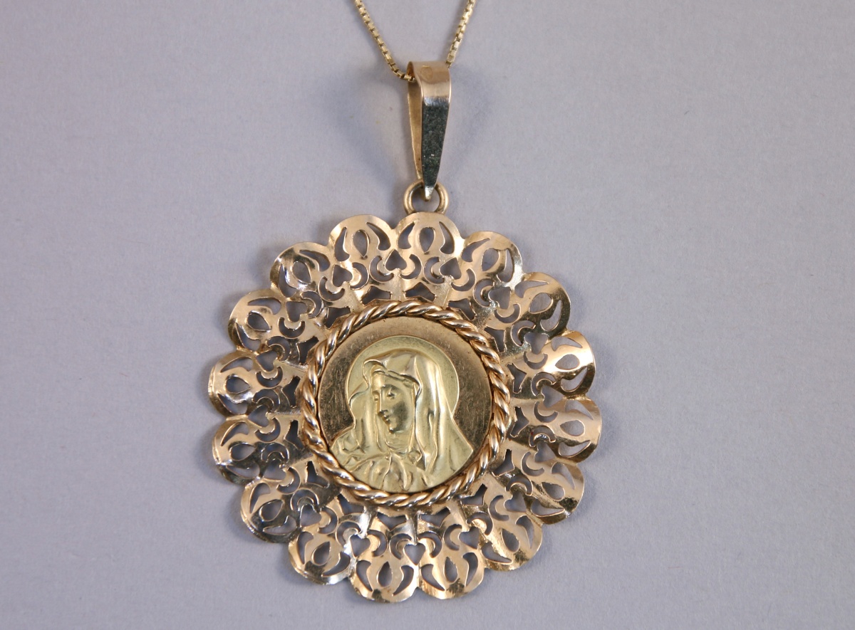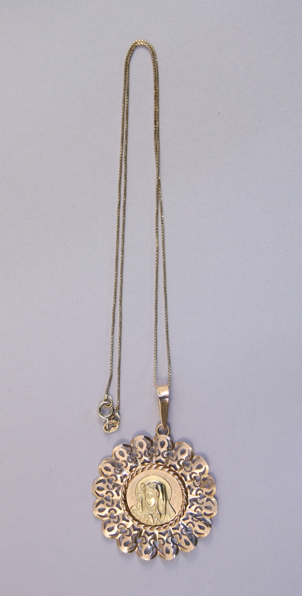 CHAÎNE en or jaune 18K. Maille vénitienne. Long. 42 cm. Poids: 1,4 g. Travail italien. Avec un PENDENTIF en or jaune 18K centré d'une médaille la sainte Vierge ceinte d'un motif rayonnant ajouré. Travail étranger. Diam. 3,5 cm. Poids: 5,2 cm.