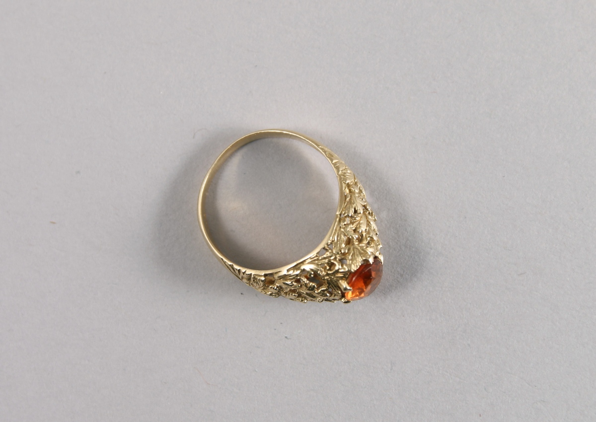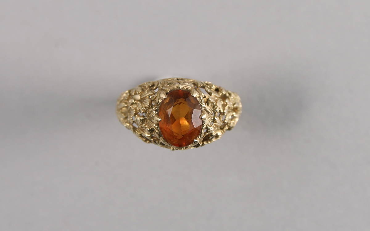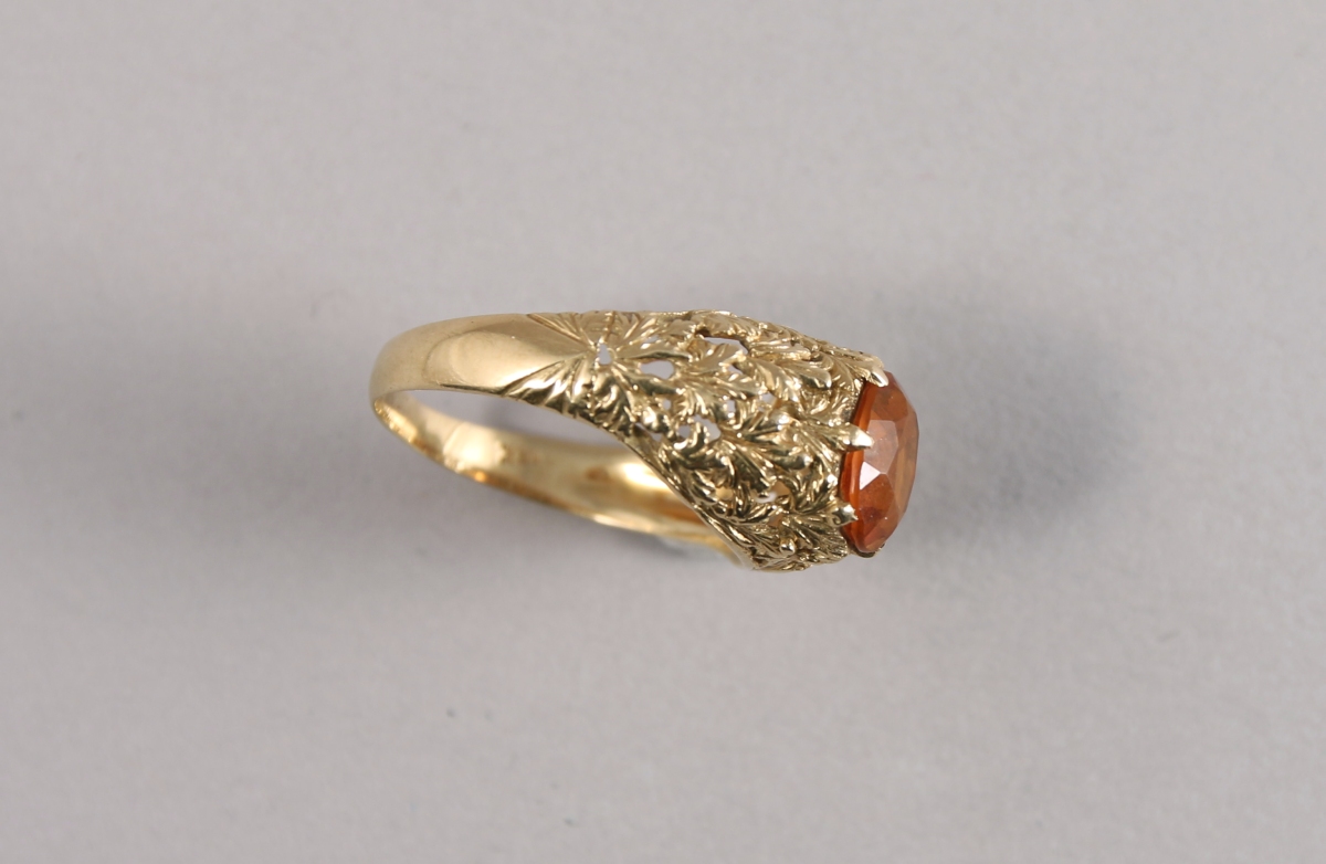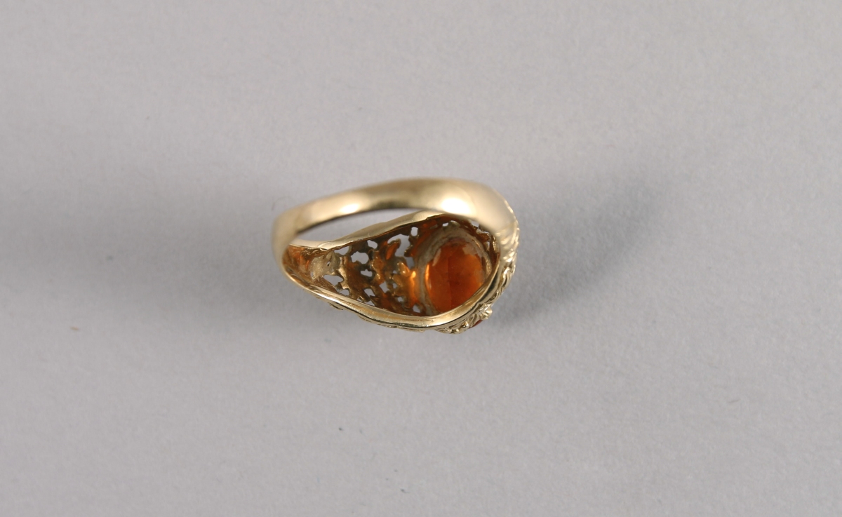 BAGUE en or jaune 18K à fin décor feuillagé ajouré. Elle est sertie d'une citrine (?) taille ovale.