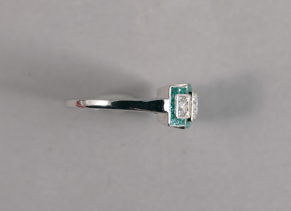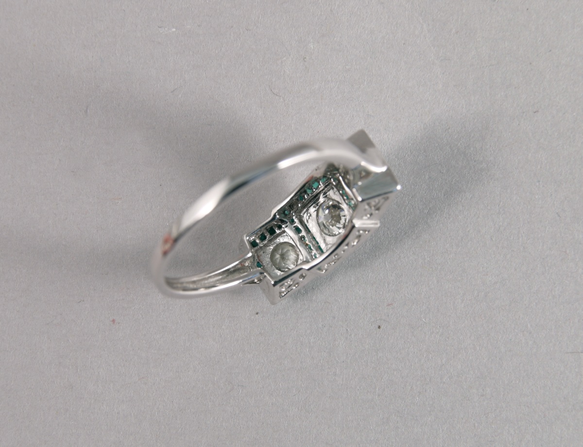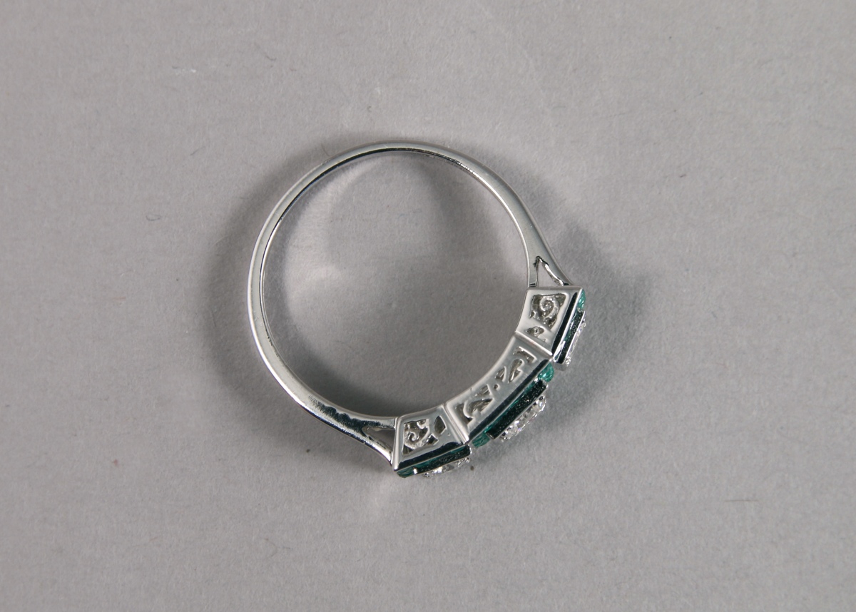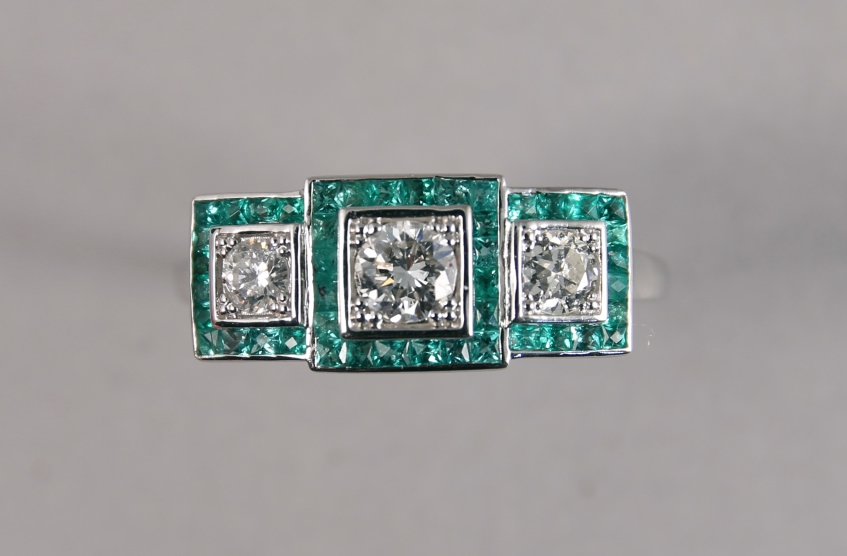 BAGUE style Art Déco en or blanc, ornée de trois DIAMANTS blancs taille moderne d'environ 0,40 carat dans un entourage de 44 ÉMERAUDES taille calibré d'environ 2.70 carats.