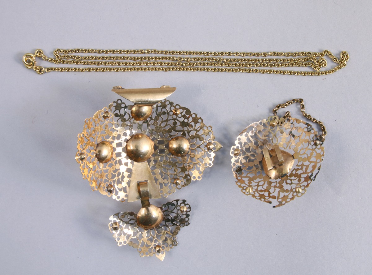 CROIX NORMANDE en or jaune composée de trois éléments finement ajourés de rinceaux et semés de pierres du Rhin (ou strass).