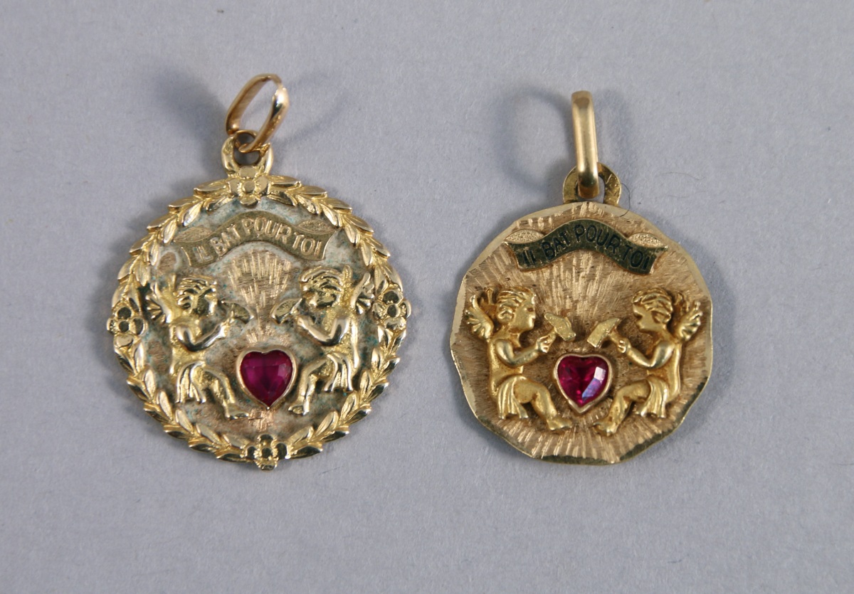 2 MÉDAILLES en or jaune 18K ornées d'une pierre rose taillée en coeur entourée de deux amours avec l'inscription "il bat pour toi".