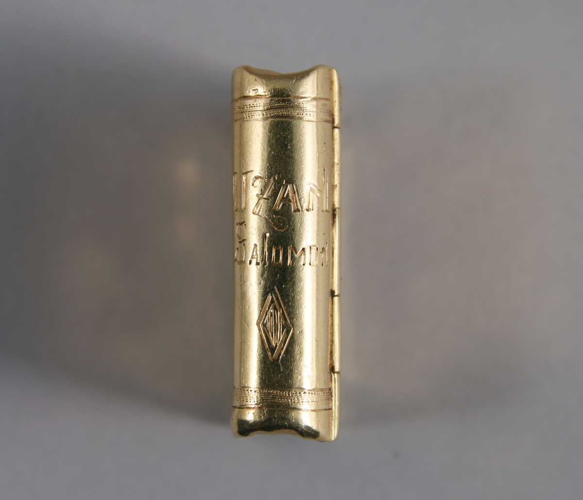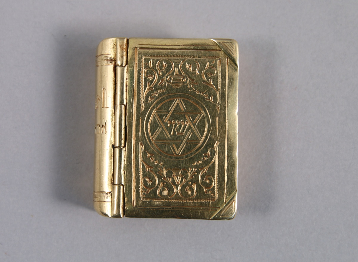 TABATIÈRE en or jaune 14K adoptant la forme d'une Thorah. Le couvercle supérieur à charnière ciselé de rinceaux et centré d'une magen David.