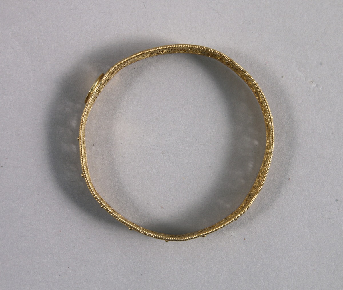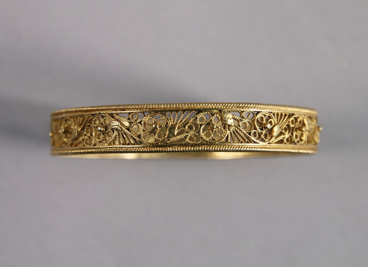 BRACELET D'ENFANT en or jaune à fin décor floral stylisé filigrané. Les bords ornés d'une frise de câbles.