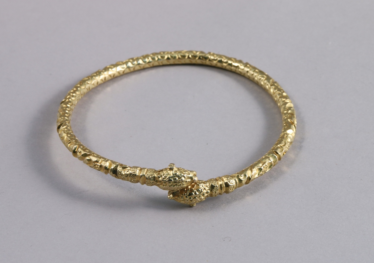 BRACELET TORQUE en or jaune 18K (plein). Il est orné de deux têtes d'animal fabuleux. Le corps ciselé.