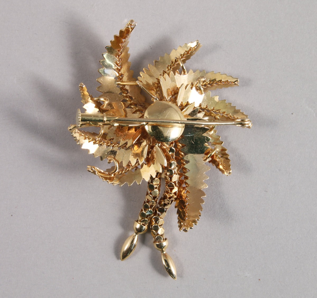 BROCHE à motif de feuilles de palmier rayonnantes retenant deux ferrets par une maille vénitienne.