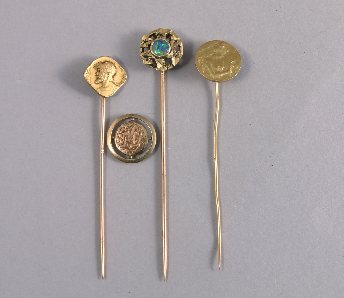 3 ÉPINGLES de CRAVATE et 1 MÉDAILLE MIRACULEUSE en o jaune 18K. 1 épingle ornée d'un profil antique, 1 d'une jeune fille effeuillant une marguerite et 1 d'une pierre verte.