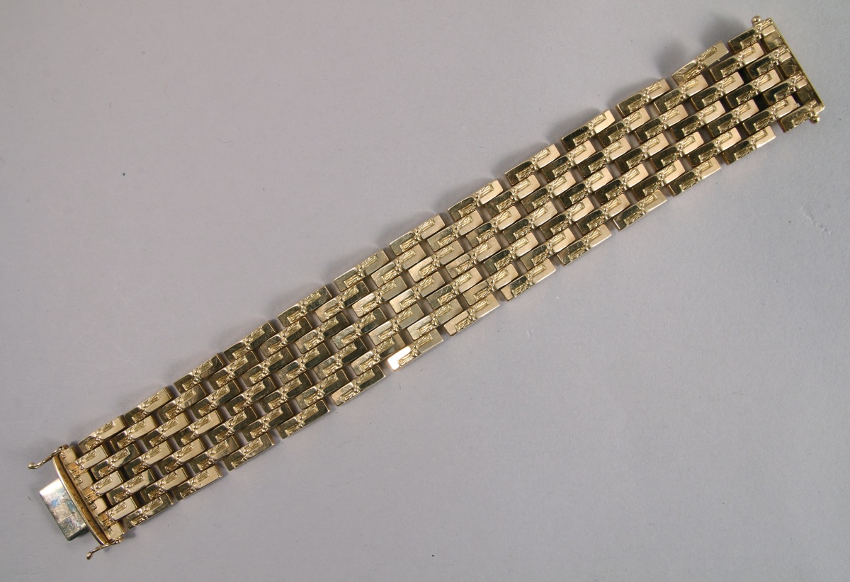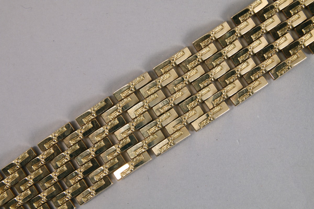BRACELET TANK en or jaune 18K, à large mailles gravées et articulée. Poinçons au Poisson, 750 et "462VI".