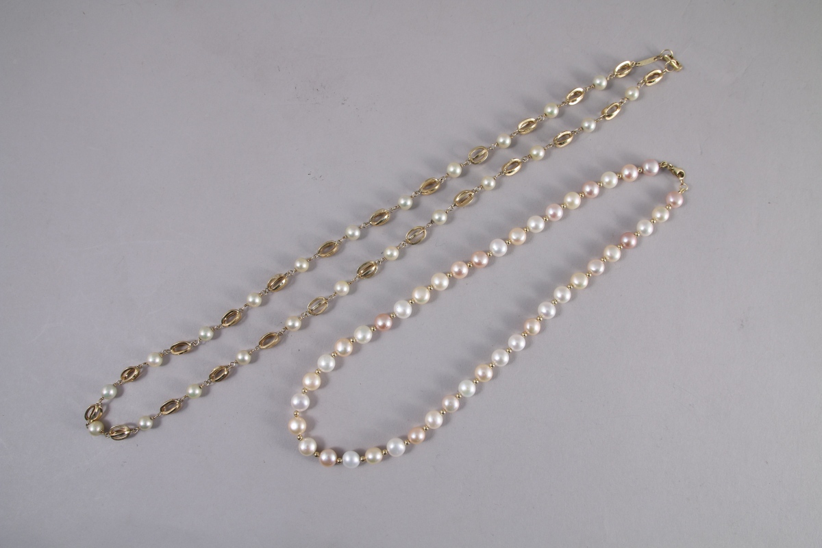 - COLLIER de perles de culture, certaines teintées, alternées de petites boules d'or.